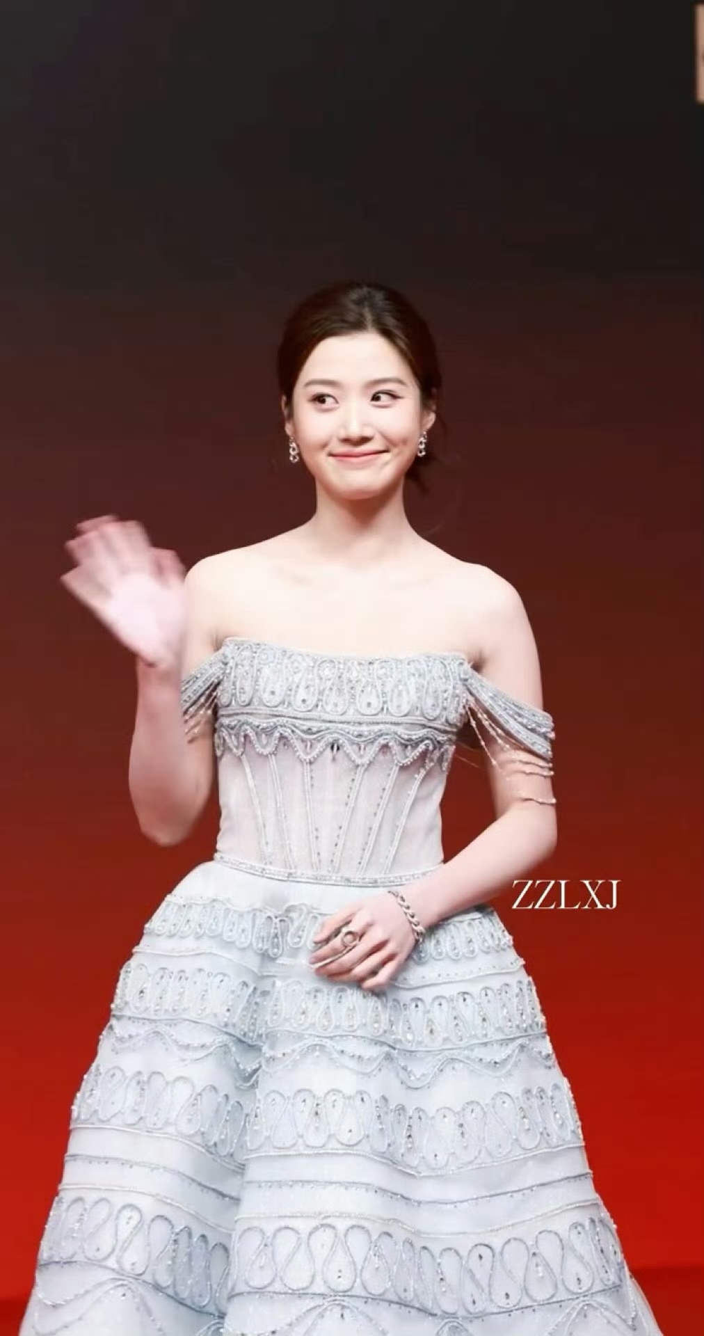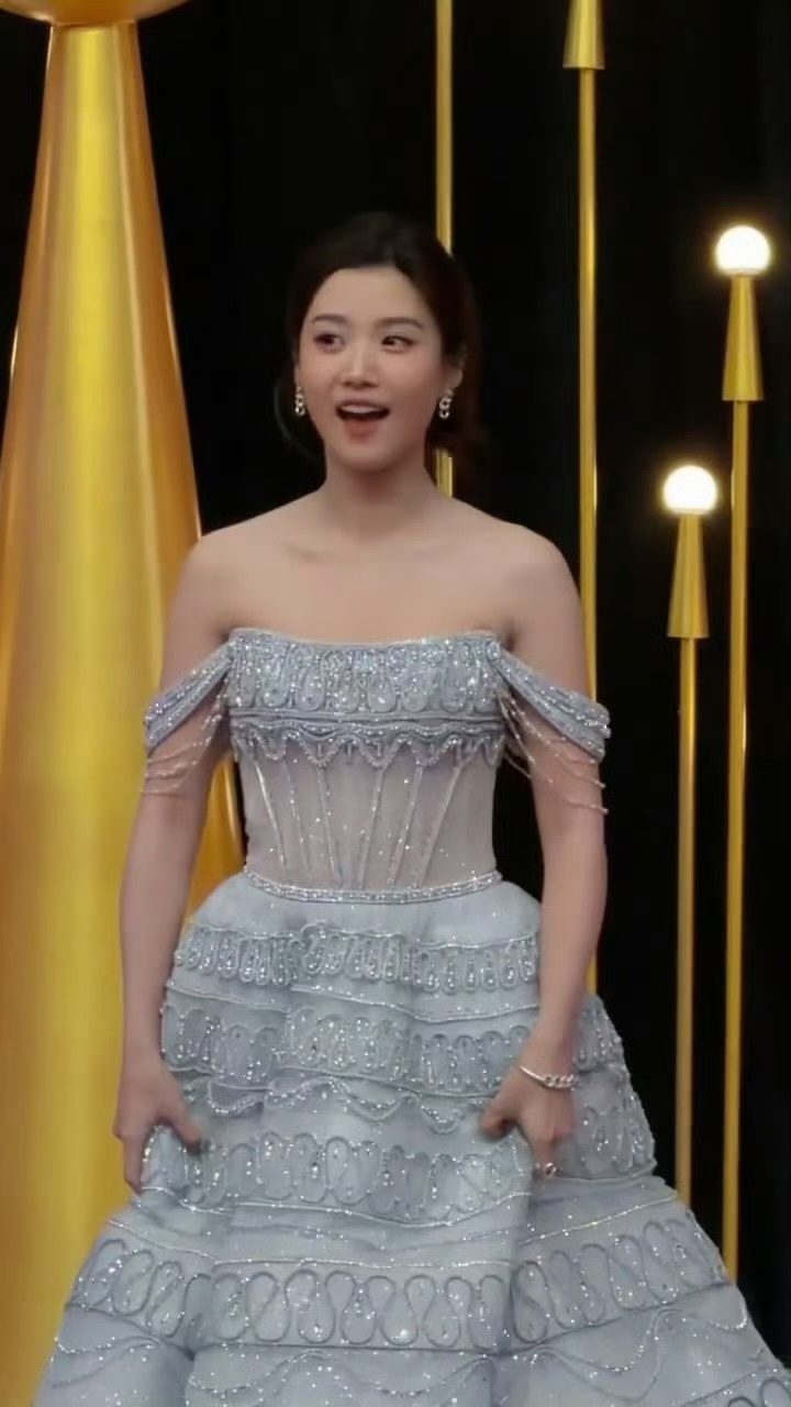 卢昱晓代言人盛典造型,浅蓝色闪钻露肩礼裙好美