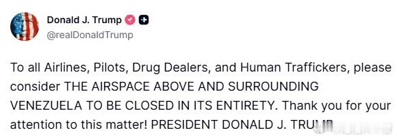 川普总统真相社交 11.28.25 美国东部时间上午07:43发文:“致所有航空公司、飞行员、毒贩和人口贩运者,请考虑委内瑞拉上方和周围的领空将完全关闭。 感谢您对此事的关注! 唐纳德·J·川普”这是要开始了吗?海外新鲜事海外新鲜事美国将对委内瑞拉展开军事行动