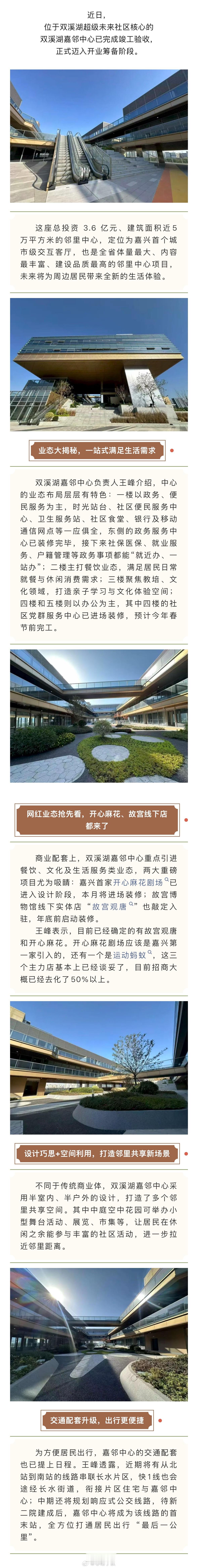 【嘉兴又有一新地标竣工 !开心麻花、故宫线下店都要来】近日,位于嘉兴双溪湖超级未来社区核心的双溪湖嘉邻中心已完成竣工验收,正式迈入开业筹备阶段。(嘉兴发布)同城热点创作计划