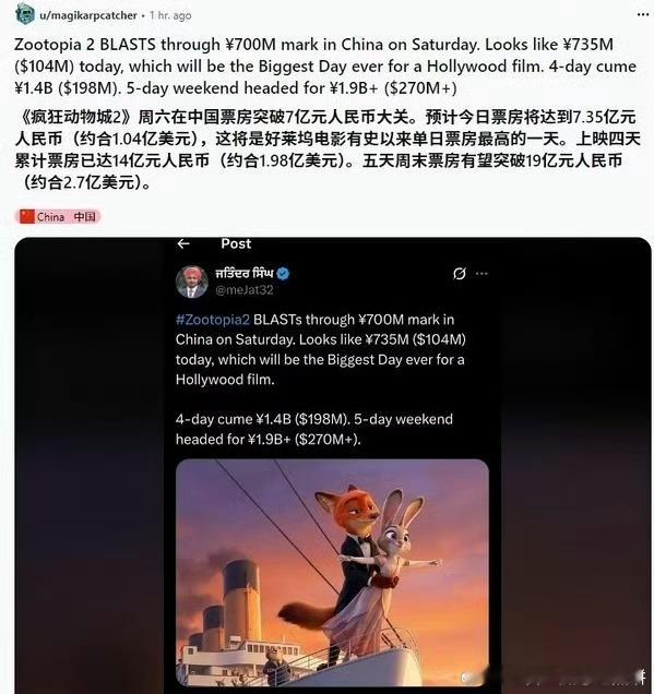 疯狂动物城2预测票房达到了42.63亿了,reddit票房社区也在讨论