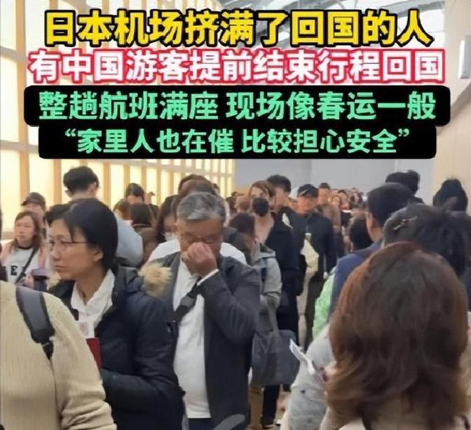 官方警告也没用!日本机场挤满回家的中国人,机票涨价仍一票难求 别做梦了!出国玩回不来,谁来买单? 中日关系变紧张,外交部和文旅部从十一月中旬就发了预警。 成田凌晨四点像赶集。 国航、东航值机队伍绕着大厅半圈。 有人裹着外套坐行李箱,盯着抢票软件不眨眼。 一位带娃妈妈说:直飞一千二的票没了,经首尔要六千八。 关西安检队排到国际出发厅,退税窗口人山人海。 退休阿姨天天掏八百住酒店,说滞留下去养老钱都要花光。 最便宜的经香港还得飞十七个小时。 航班取消不断,天津飞关西取消率65%,南京飞大阪近六成。 国航、南航、东航把11月15号到12月31号的票免费退了。 保险公司把官方预警写成免责条款,赔不了。 大使馆热线在,但明确不兜底机票。 网络分两派:骂“活该”的多,怜悯亏两万的也不少。 别想着白嫖安全,别让沉没成本把你栽了。 你怎么看?评论里说说。 素材来自网络,侵权联系删除