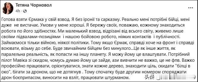 叶尔马克的“未来”有着落了,乌克兰辞职的“影子总统”,乌克兰总统办公室主任叶尔马克在辞职后宣称“自己要去前线”,现在好了,未来有着落了。 为乌军作战的乌克兰女议员塔季扬娜·乔尔诺沃尔发文称,如果叶尔马克愿意来前线,准备让叶尔马克担任“无人机操作员” 塔季扬娜·乔尔诺沃尔在文中说,“我准备接收叶尔马克进入我的排。我这话不带讽刺和讥讽。我真的需要战斗人员,非常缺人。我这里的条件不错。我珍惜并尊重我的每一位部下,会根据每个人的能力分配任务。我们是一个小排,与世隔绝,生活只围绕着我们的地下室-阵地和战斗任务,没有任何外界接触和公开活动。我们只专注于战争,不涉及任何政治。 所以,如果叶尔马克真的想来前线,真的想战斗,我会接收他到我这里。 他将成为一名没有过去的普通士兵,这就像另一种人生,像平行现实,像是到了另一个星球。我可以为他安排这个。 我们还需要一名能投弹的“Mavic”无人机操作员,不知为何,我觉得他会适合干这个。基础操作不难学,这不像FPV无人机。难的是专业地操作、识别地形、熟悉每一棵树、发现目标、精准投弹,指哪打哪,以及去捡那些没能飞回来的无人机。 所以一开始他会作为副手,负责给无人机装弹、带到起飞点、担任领航员。” 不过,乌克兰这位女议员上次在参加乌克兰一访谈节目时,对乌克兰的一些问题发了很多牢骚,并抱怨说,“现在乌克兰有一种怪现象,一些真正为国家未来着想的人,几乎都被撤了职,他们很多人现在想离开乌克兰,却得不到批准。 而军队中那些把士兵的生命当成纯粹数字的指挥官,反而是最容易被提拔,晋升。这种现象比比皆是。很多人不敢多说话,因为他们担心自己第二天就永远说不了话了”