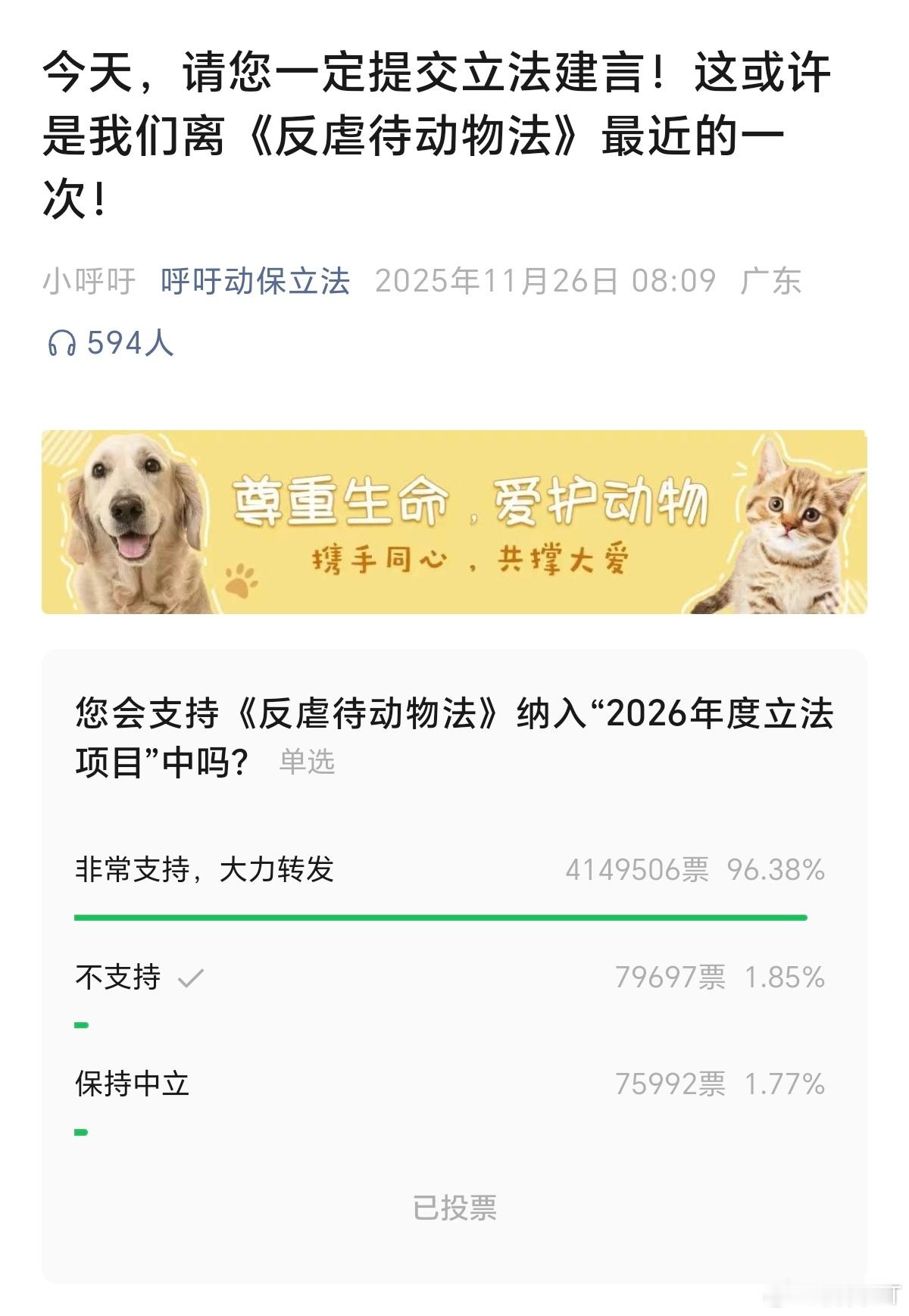 这个话题,还有个更有意思的地方在于:相关投票的发起者,事实上是个宠保账号。那关注这个账号的,又都是些什么人呢?毫无疑问是宠保人士。宠保账号发起,宠保人士参与,哪怕投票支持的人数再多,又有什么意义呢?打个比方。我去妇幼保健院做采访,能以该地的生育意愿达到99.9%,得出大众当下的生育意愿极为强烈吗?410万网友力挺反虐待动物法立法