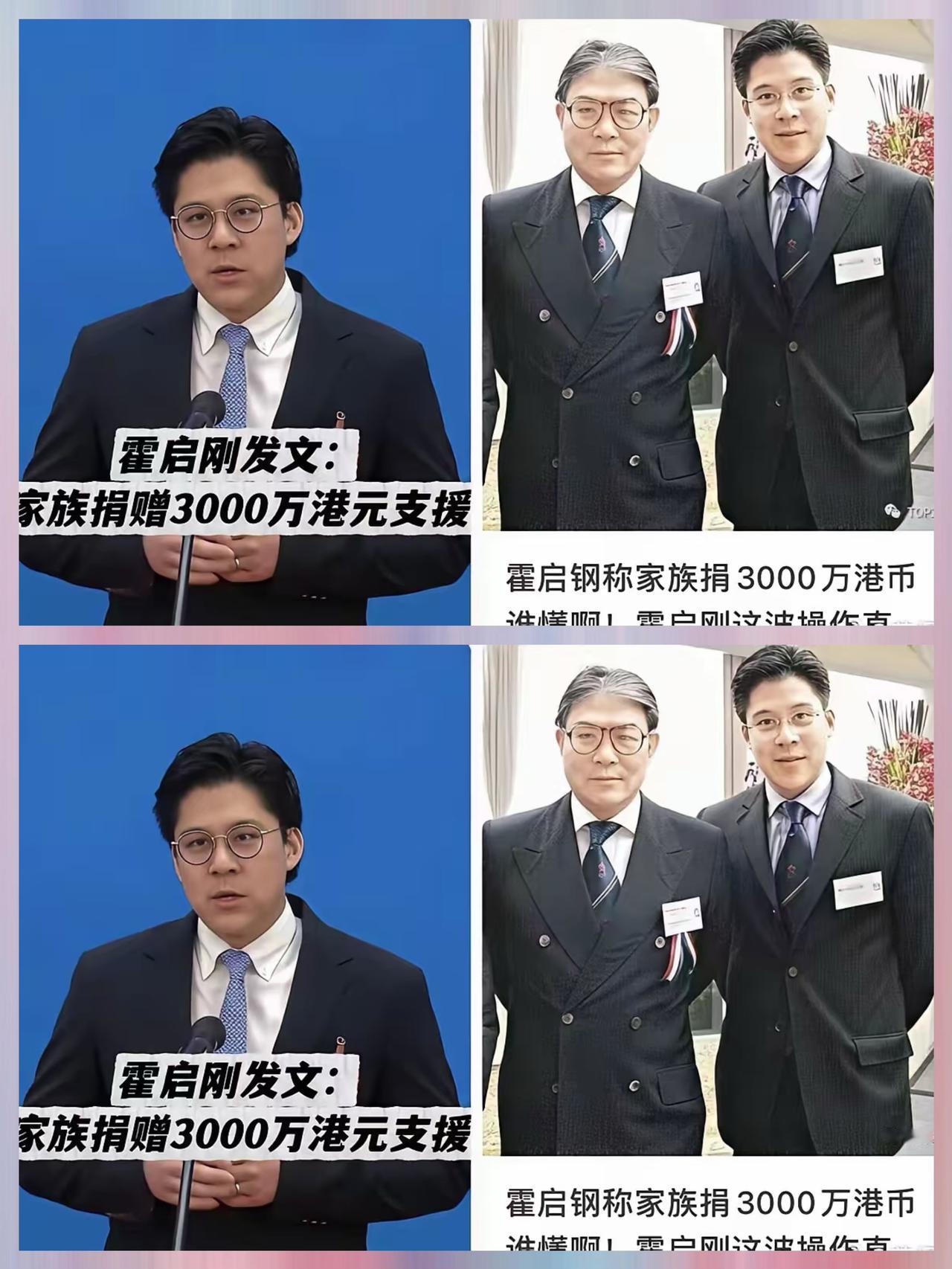 霍启刚说, 他以后再不为灾情犯难, 不是因为家族钱多, 也不是因为政府给力, 而是因为大家都在伸手。 香港火灾那晚他彻夜难眠, 家族捐3000万后更想号召众人, 如今港内、 内地甚至国外的朋友都主动搭手, 每份心意都在往灾区汇聚。 难关从不是靠一人扛, 而是无数人拧成一股绳!