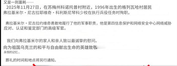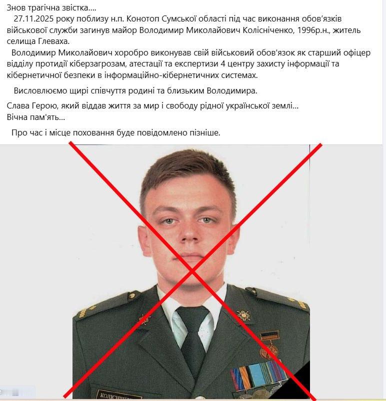 2025年11月27日,俄罗斯一架“格朗-2”无人机在乌克兰苏梅州克罗列韦茨附近发动袭击,摧毁了一个乌克兰网络安全指挥中心,并导致29岁的高级网络威胁官员弗拉基米尔·尼古拉耶维奇·科列斯尼琴科少校丧生。 配图是科列斯尼琴科身着制服的肖像,照片上被一个红色的“X”标记,内容与帖子中的细节相呼应,包括他在乌克兰特别通信局负责打击网络威胁的部门职责。