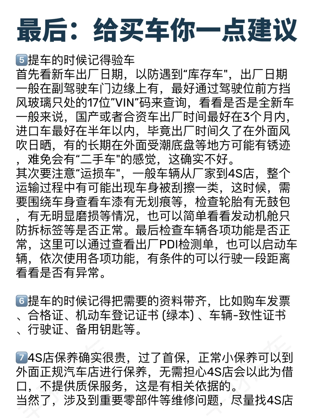 6⃣️提车的时候记得把需要的资料带齐,比如购车发票、合格证、机动车登记证书 (绿本) 、车辆致性证书、行驶证、备用钥匙等