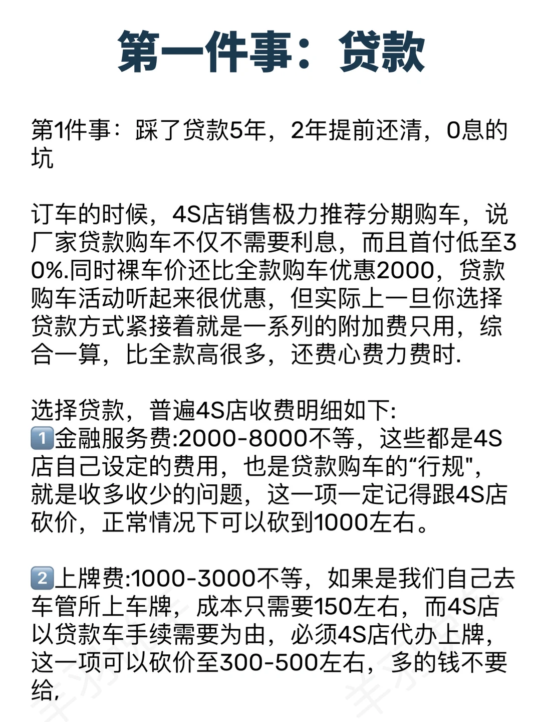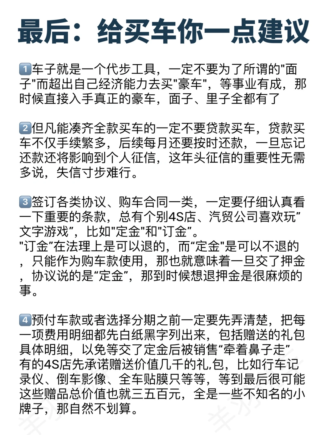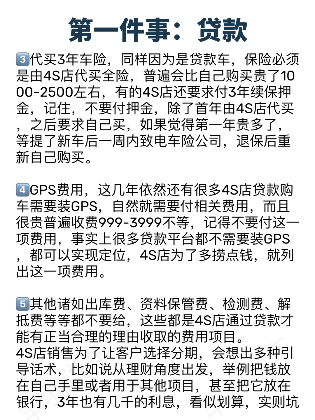 4⃣️预付车款或者选择分期之前一定要先弄清楚,把每一项费用明细都先白纸黑字列出来,包括赠送的礼包具体明细,以免等交了定金后被销售“牵着鼻子走”