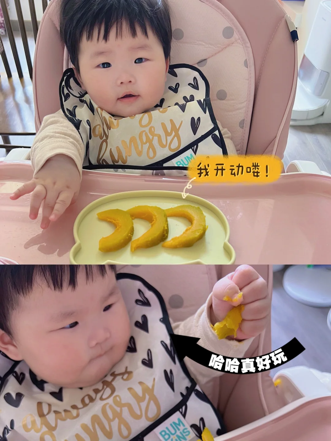 👧:7个月➕8天 🥣:胚芽米➕核桃油➕玉米➕猪里脊➕南瓜 ⏰:上午11:30 📝:10g胚芽米100ml水➕2滴核桃油➕3勺玉米泥➕3勺猪肉泥➕适量南瓜 🍽️:下午加餐:橙子🍊 🥣柒柒看到南瓜手指食物一开始认真吃了几口,后来就开始玩起来了😅玩得到处都是… 收拾完残局才开始吃粥,吃完喝了50ml水,下午加餐橙子🍊咬咬乐。 ⚠️宝宝刚添加手指食物的时候,不要要求她能全部吃完,主要是为了锻炼她手指抓握、咀嚼和自主吃饭的意识,她也在慢慢探索,玩的到处都是也不要焦虑哈,洗洗就干净了😂