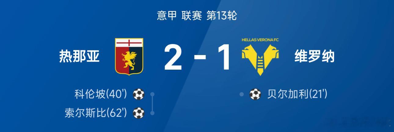 11月29日讯 25/26赛季意甲联赛第13轮,热那亚2-1战胜维罗纳。上半场第21分钟,贝尔加利破门帮助维罗纳取得领先。半场结束前,科伦坡取得进球,帮助热那亚1-1扳平比分。易边再战,索尔斯比利用定位球头球破门,帮助热那亚反超比分。余下的比赛时间内,凭借门将莱亚利的出色发挥,热那亚成功将领先优势保持到了终场,最终收获三分。意甲意甲联赛热那亚vs维罗纳