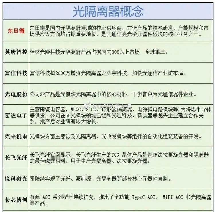 发现一个超级好的题材!!! 最近,上网发现一个超级好的题材,它就是光隔离器。所谓的光隔离器,指的是光通信过程中,防止光反射影响信号的传输的一种元器件。查了查资料发现,这种元器件主要用于光模块的生产过程中。 其中,光模块的主要成本就是光隔离器。那么,由此可以推断,出光模块的用途越广,这个光隔离器的用量会越大。 随着人工智能的大力发展,光模块的三剑客,大家也都知道,易中天都长成什么样子了?随着光模块的需求量和出货量越来越大。那么,这个光隔离器早晚也会被市场发掘。到时候,这个光隔离器的一些上市公司的业绩也会出现非常炸裂的增长。 所以说,现在提前布局光隔离器有关的上市公司是一个不错的选择,就是不知道市场认不认这个题材。我先提前埋伏一点。下面是我自己在网上找的一些光隔离器,相关概念股。大家可以认真、仔细、研究,一起探讨。(以上观点仅供参考,不构成投资建议)。点赞,评论是对我最大的支持,谢谢。