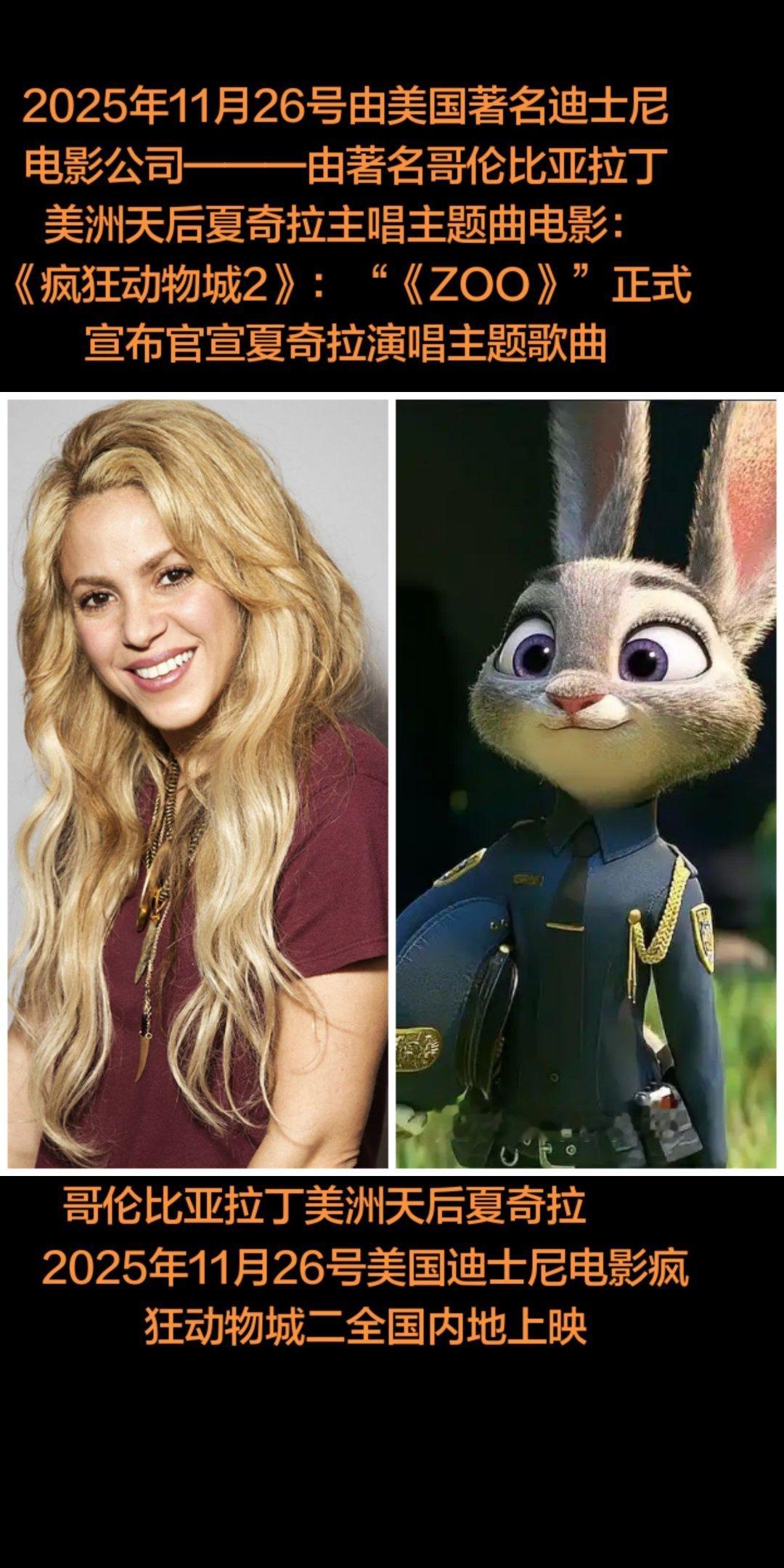 2025年11月26号由美国著名迪士尼电影公司———由哥伦比亚拉丁美洲流行女歌手天后夏奇拉主唱电影主题曲《ZOO》正式宣布官宣由哥伦比亚著名拉丁美洲天后夏奇拉主唱演唱: