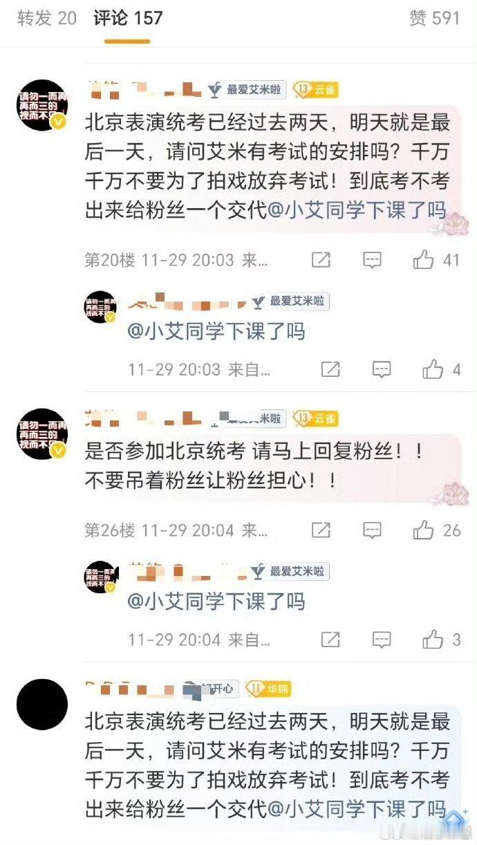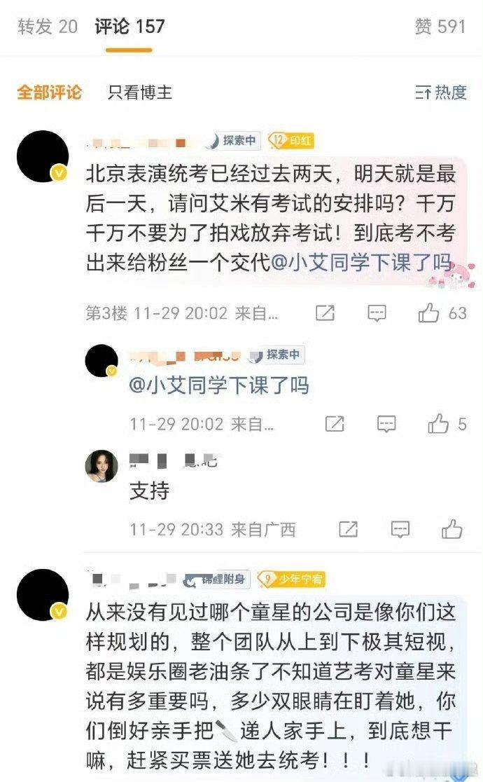 艾米粉丝在艾米工作室下提意见了作为童星出道的艾米现在才17岁,正是快要参加高考艺考的年纪,但现在还一直在进组拍戏,粉丝想让艾米以学业为重