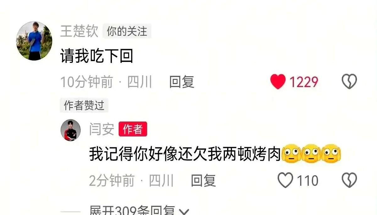 头哥今天心情爆好,居然空降闫安评论区了! 闫安两口子发了逛吃视频,看着确实让人想跟着去。结果头哥突然留言“请我吃下回”,闫安直接回“你还欠我两顿烤肉呢”——这俩队友互怼太好笑了! 网友都好奇:备战期咋有空上网?猜是不是练混双时在搭档面前耍帅逗乐了,想看看大家啥反应,顺便给队友留个言。 别说,这猜测还挺像头哥的风格,毕竟他有时候确实爱搞点小机灵。不过备战期能抽空轻松下,队友间闹闹也挺正常的,总绷着也不行嘛。