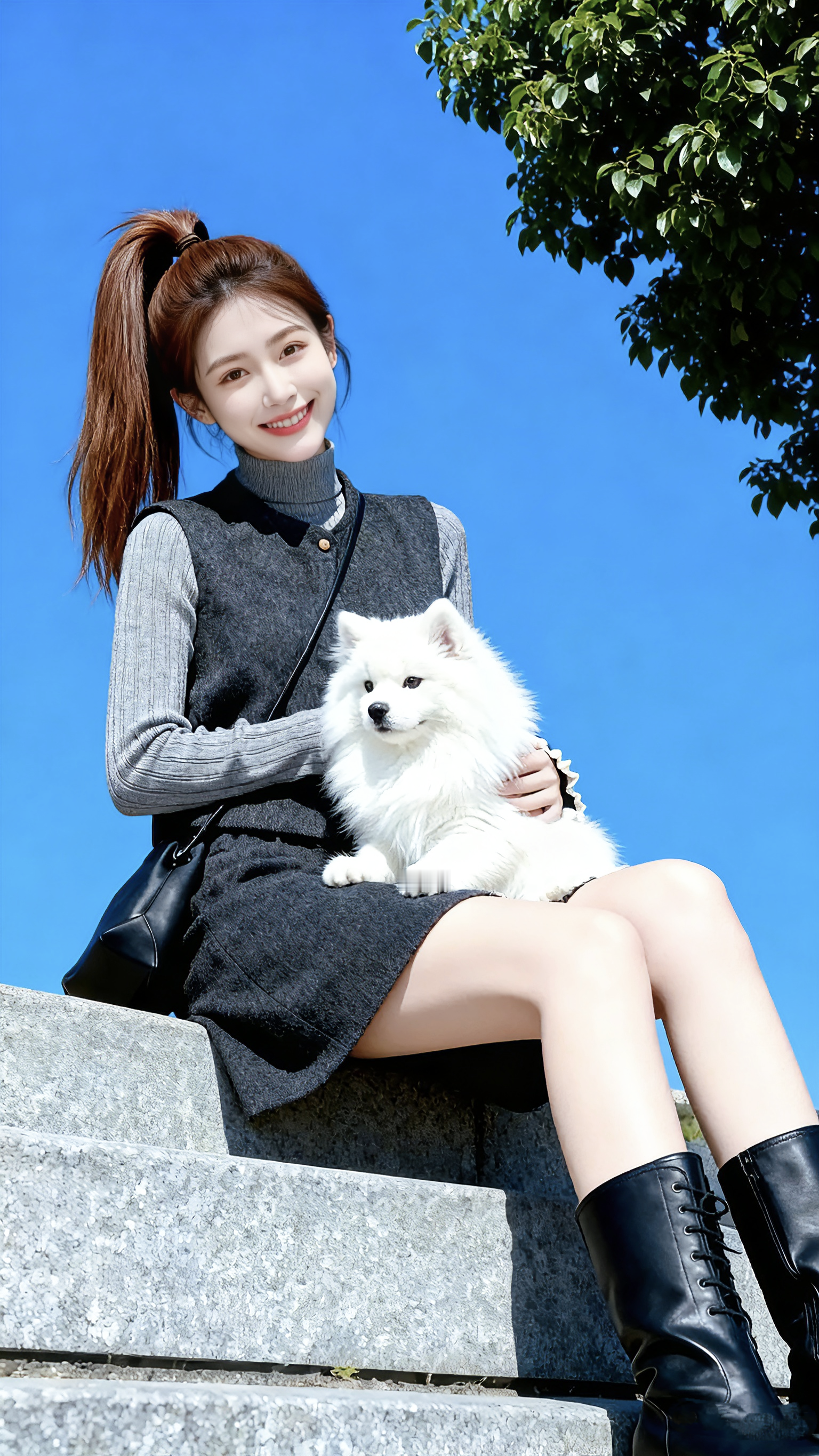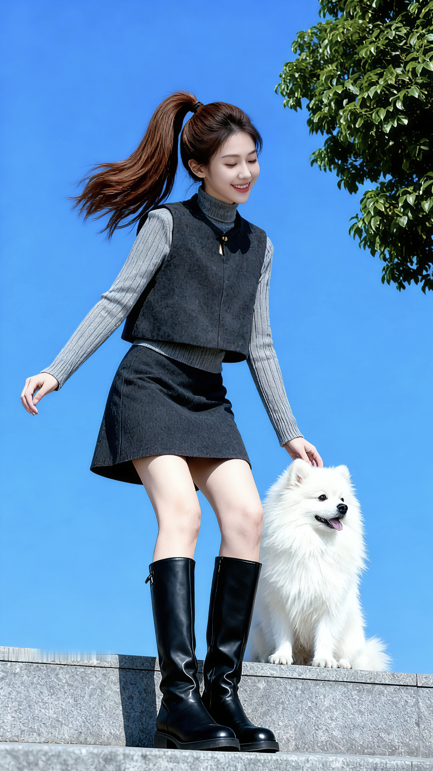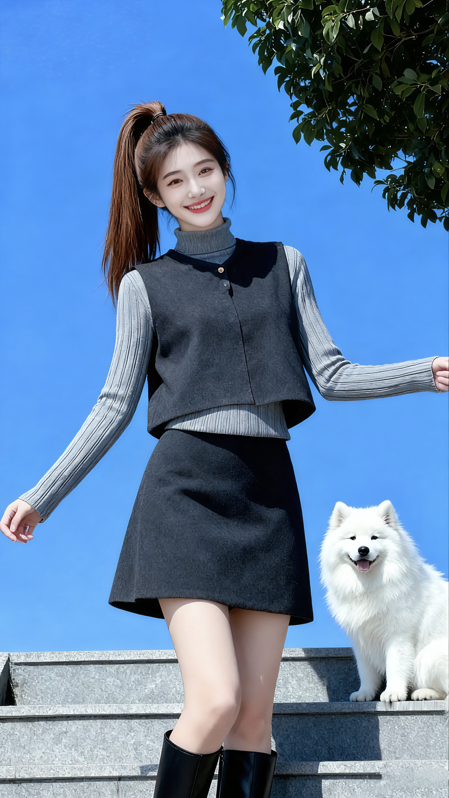 《灰调晴空下的松弛氛围感》 林晚微这身灰调穿搭,活脱脱是都市文里走出来的女主角——高领针织衫贴合脖颈,裹着满溢的暖软;短款马甲藏着编辑部姐姐三番夸赞的显瘦巧思,同面料短裙勾勒出纤细腰肢,搭配的长靴靴筒恰好卡在腿部最直的线条处,利落又显比例。 她蹲在台阶上抬手遮阳的瞬间,风携着清甜桂香掠过裙摆,怀里的白博美也亲昵地蹭着裙角打转,画面温柔得不像话。面料软得如同小说里男主角衬衫的内衬,上周降温穿它跑采访,空调房里透气不闷,楼道穿行时保暖不凉。同事们追着问链接的间隙,她正举着相机定格蓝天,笑靥里的梨涡浅浅,比小说中初冬登场的女主角,更添几分灵动鲜活。原来我是冬日穿搭小天才 素颜冬季穿搭新思路 时尚小衫 女神范 最美穿搭