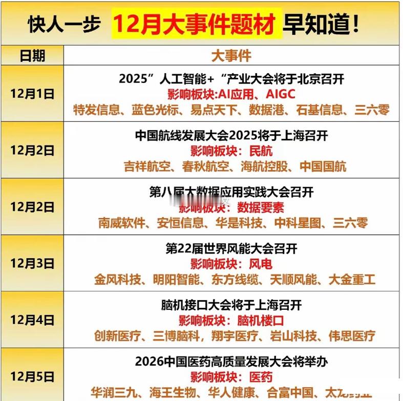 12月1日-5日的行业大会题材日历梳理!本次梳理覆盖AI应用、民航、数据要素、风电、脑机接口、医药六大板块,均为行业级会议驱动的短期事件催化机会——会议聚焦产业落地、趋势升级,对应板块概念股将受情绪带动,同时需关注会议中的政策、订单等实质利好。12月1日:2025“人工智能+”产业大会(北京)大会聚焦AI与实体产业融合,推动AI应用、AIGC赛道的落地案例与订单释放,是AI从技术到商业场景的关键催化节点,短期提升相关板块关注度。1. $特发信息 sz000070$ 聚焦AI+通信,其AI算力网络解决方案适配大会的AI落地需求,已参与政企端AI通信项目,短期受益AI应用场景拓展的热度催化。2. $蓝色光标 sz300058$ AIGC营销龙头,将在大会展示AI生成内容的营销案例,已服务多个品牌的AI营销项目,会议或推动其新增企业级AIGC订单。3. $易点天下 sz301171$ AI跨境营销服务商,其AI投放工具适配出海企业需求,大会或加速其AI营销工具的行业渗透,短期受AIGC赛道热度带动。4. 数据港AI算力基建服务商,为AI应用提供数据中心算力支撑,大会推动的AI落地将提升其数据中心的算力需求,间接受益板块热度。12月2日:中国航线发展大会+大数据应用实践大会中国航线发展大会聚焦民航航线优化、市场拓展;大数据应用实践大会推动数据要素落地,双事件分别催化民航、数据要素板块的短期情绪。1. 吉祥航空民营航司龙头,航线大会或涉及新航线审批利好,其国内干线+支线布局将受益于航线优化政策,短期受民航板块情绪带动。2. 春秋航空低成本航司代表,航线大会的市场拓展方向契合其下沉市场布局,有望新增支线航线资源,短期催化估值修复。3. 南威软件数据要素龙头,大数据大会将展示其政务数据要素解决方案,已参与多地数据交易所建设,会议或推动其数据运营订单落地。4. 安恒信息数据安全服务商,适配大数据应用的安全需求,大会或展示其数据要素安全方案,受益于数据要素落地的安全配套需求。12月3日:第22届世界风能大会大会聚焦风电技术升级、全球市场拓展,推动风电设备、零部件赛道的需求释放,短期提升风电板块的景气度预期。1. 金风科技风电整机龙头,将在大会展示新型风机技术,其海外市场布局契合全球风电拓展方向,会议或推动其海外订单增长。2. 明阳智能海上风电龙头,大会将展示漂浮式风电技术,其海风设备适配全球海上风电需求,短期受益海风赛道的热度催化。3. 东方线缆风电电缆龙头,其海缆产品适配海上风电项目,大会推动的海风项目落地将提升其电缆需求,间接受益板块景气度。4. 天顺风能风电塔筒龙头,其塔筒产能覆盖国内外项目,大会的全球风电拓展将带动其海外塔筒订单,短期受板块情绪带动。12月4日:脑机接口大会(上海)大会聚焦脑机接口技术的临床应用、产业落地,推动医疗级脑机设备、神经科学技术的商业化,短期催化脑机接口主题热度。1. 创新医疗脑机接口临床合作企业,与科研机构合作布局脑机项目,大会或展示其临床进展,短期受脑机赛道主题热度带动。2. 三博脑科神经外科医疗龙头,具备脑机接口临床应用的医疗资源,大会或涉及脑机临床合作项目,受益技术落地的医疗端需求。3. 翔宇医疗康复医疗设备商,布局脑机接口康复设备,大会将展示其脑机康复方案,适配神经康复的临床需求,短期受主题催化。4. 岩山科技脑机接口技术研发企业,聚焦非侵入式脑机设备,大会或展示其技术进展,受益脑机产业的技术落地热度。12月5日:2026中国医药高质量发展大会大会聚焦医药行业创新、质量升级,推动中药、医药流通等赛道的规范与发展,短期提升医药板块的关注度。1. 华润三九中药龙头,大会将展示其中药创新产品,其品牌中药布局契合高质量发展方向,短期受中药板块情绪带动。2. 海王生物医药流通龙头,适配医药高质量发展的流通规范需求,其供应链布局将受益于行业整合,短期催化估值修复。3. 华人健康医药零售龙头,聚焦基层医药服务,大会推动的医药下沉方向契合其布局,有望新增基层零售资源,短期受主题带动。4. 合富中国医疗流通服务商,为医院提供设备配送服务,大会推动的医疗质量升级将提升其高端设备流通需求,间接受益板块。5. 太龙药业中药企业,布局中药创新制剂,大会将展示其中药质量升级成果,契合行业高质量发展方向,短期受中药赛道热度催化。总结12月1日-5日的行业大会是多赛道的短期事件催化:AI应用看落地订单、民航看航线政策、数据要素看运营落地、风电看技术升级、脑机接口看临床进展、医药看质量升级。短期情绪驱动为主,具备实质业务适配的龙头更易承接长期红利,主题性标的需警惕热度退潮后的波动。本文涉及资讯、数据等内容来自网络公共信息,仅供参考,不构成投资建议!