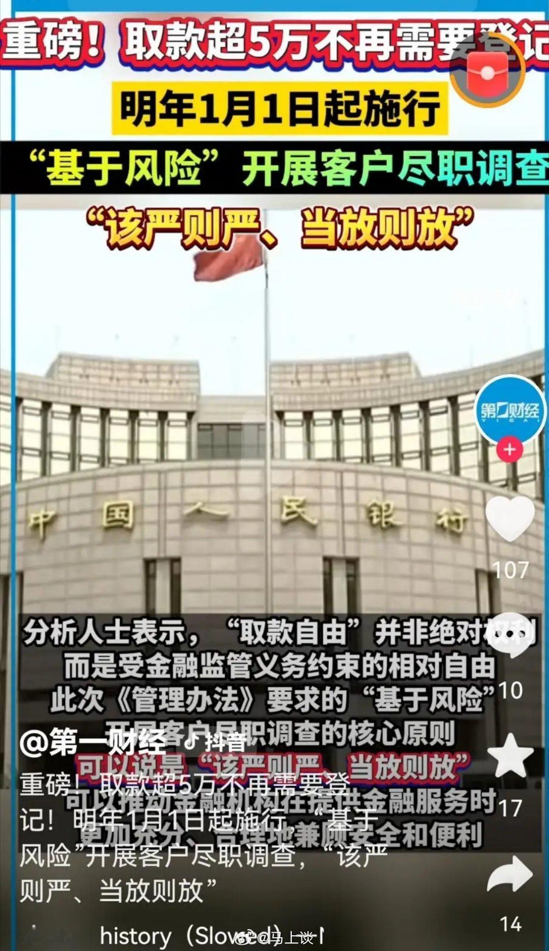 明年起存取现超5万元不用再登记,这个挺好的,不能因为极少数的人群愚蠢和无知就捆绑住绝大多数人的手脚。