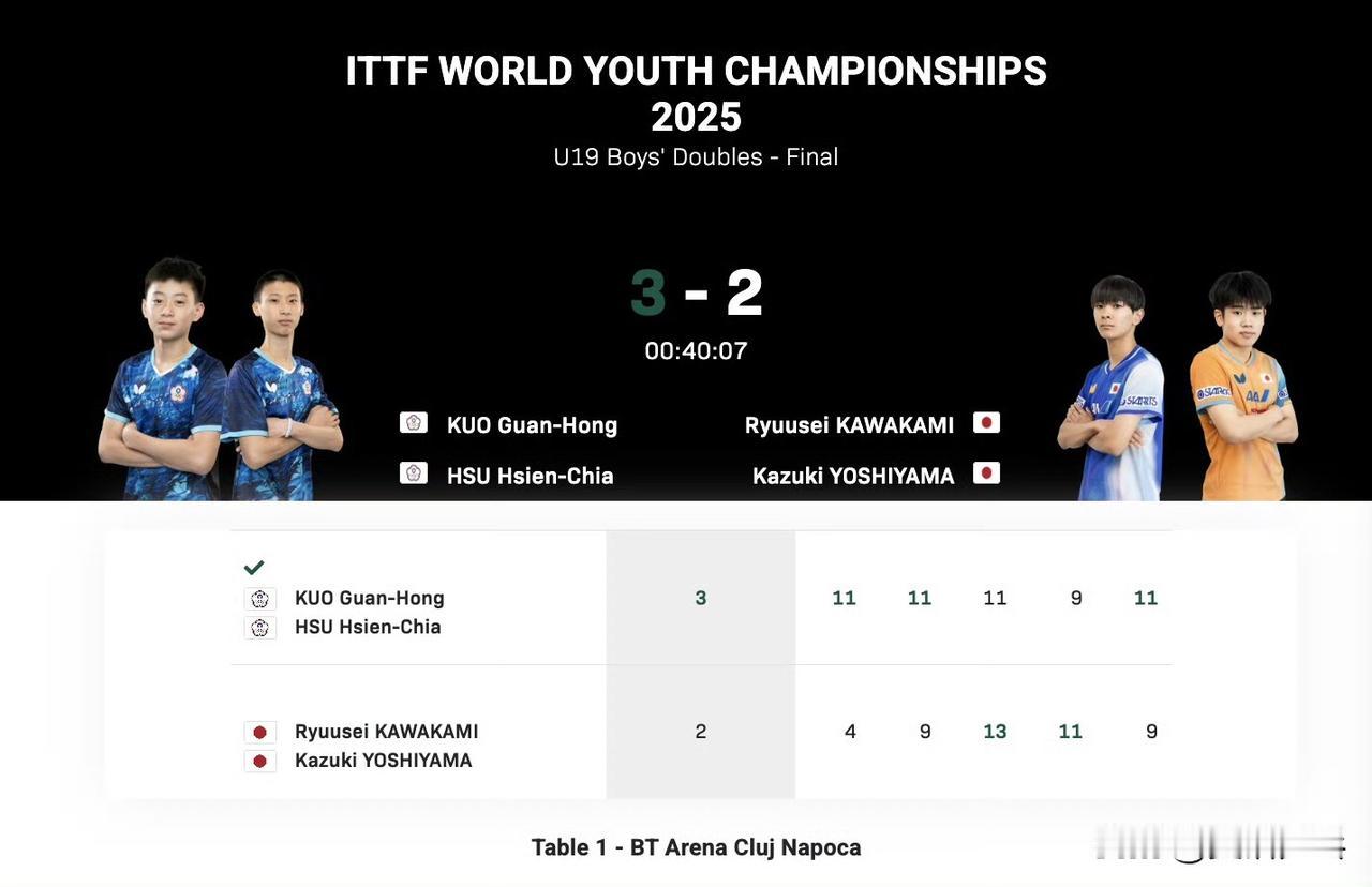 郭冠宏/徐絃家,夺得U19男双冠军! 2025世界青少年乒乓球锦标赛 U19男双决赛:11.29 郭冠宏/徐絃家(中国台北)3-2川上流星/吉山和希🇯🇵【11-4,11-9,11-13,9-11,11-9】 郭冠宏/徐絃家(中国台北)获得2025世界青少年乒乓球锦标赛U19男双冠军🥇🎉 川上流星/吉山和希🇯🇵获得2025世界青少年乒乓球锦标赛U19男双亚军🥈