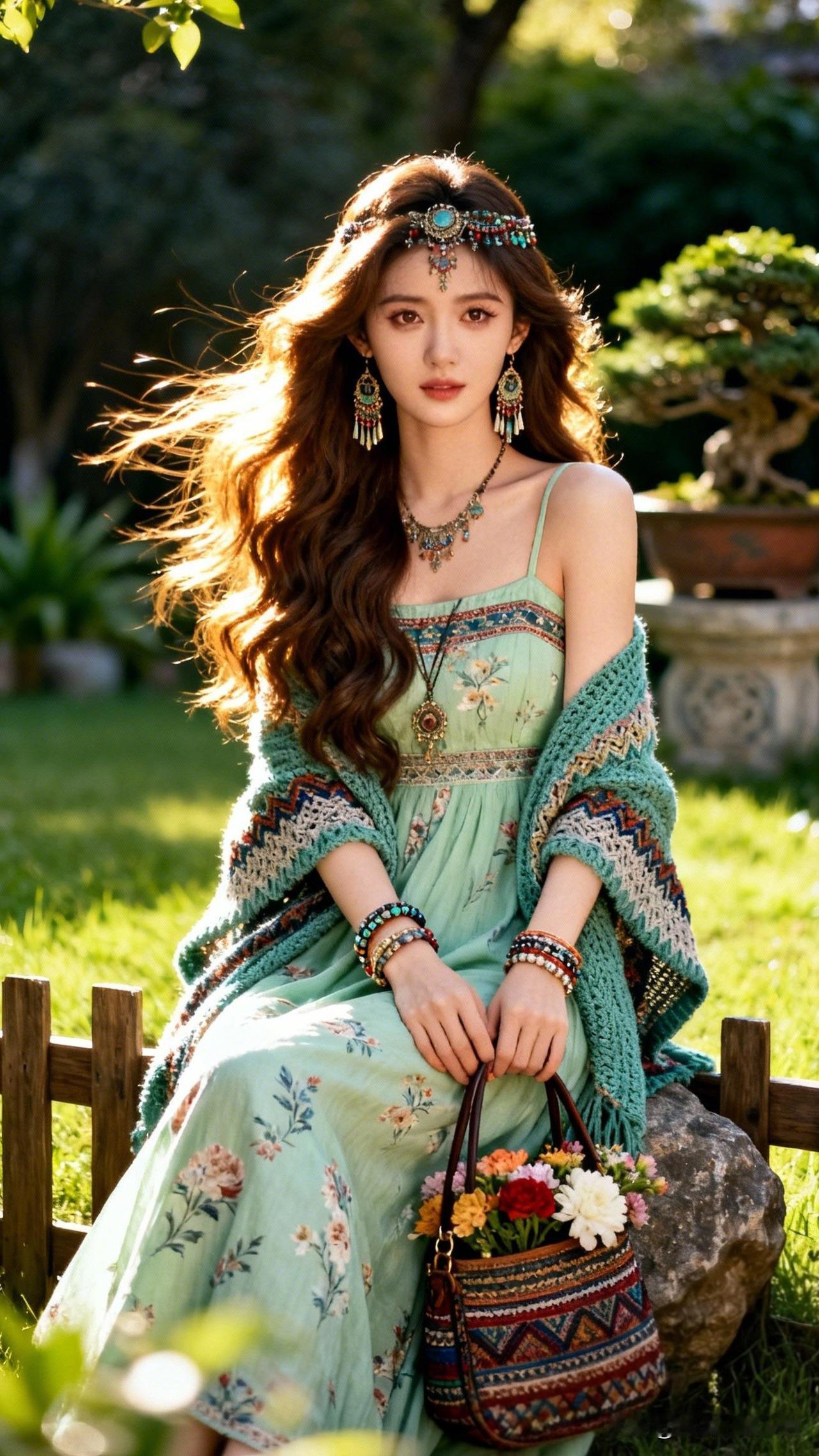 绿衣美人倚木栏,花篮相伴意悠然。每日搭配分享·时尚穿搭 梦幻森林中的仙气少女,绿意盎然,花团锦簇,美不胜收!🌿💐👗