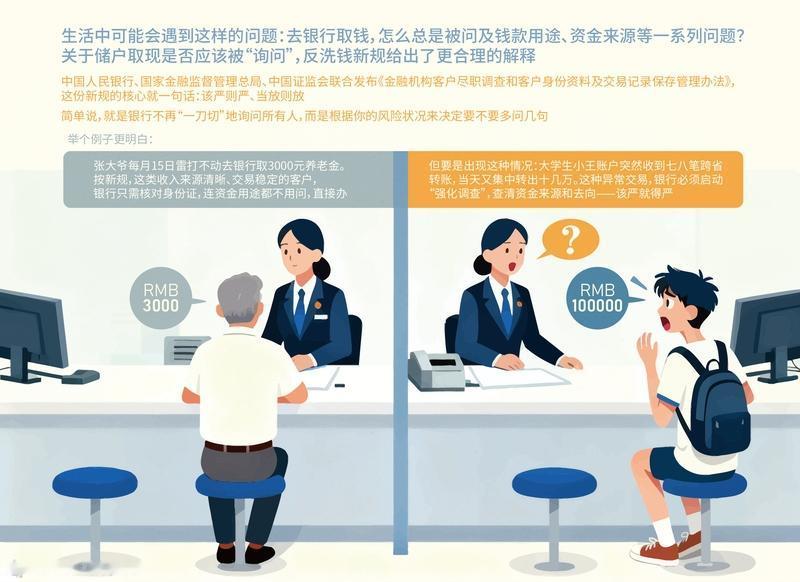 明年起,存取款超过5万元无需登记资金来源,银行将根据风险状况灵活调查,此举旨在简化流程并提升用户体验。 随着2026年1月1日起实施的新规,中国人民银行、国家金融监管总局和中国证监会联合发布的《金融机构客户尽职调查和客户身份资料及交易记录保存管理办法》正式生效。新规取消了个人存取现金超5万元需登记资金来源的规定,取款时银行将不再“一刀切”式询问所有人,而是根据风险状况来决定是否要“多问几句”。这一变化意味着,银行将在高风险情况下加强调查,了解资金来源和用途;而在低风险情形下,则采取简化措施。这一调整不仅简化了客户的取款流程,还体现了金融机构在预防洗钱和恐怖融资方面更加精准和灵活的态度。新规的实施将有助于提升金融服务的便利性和客户体验,同时也为金融机构提供了更科学的风险管理手段。