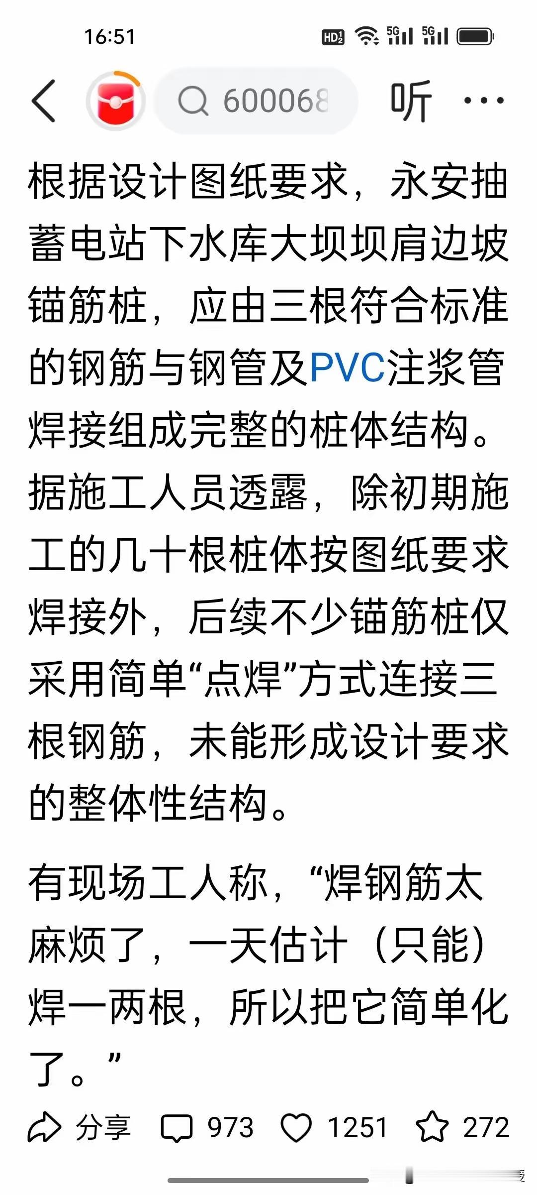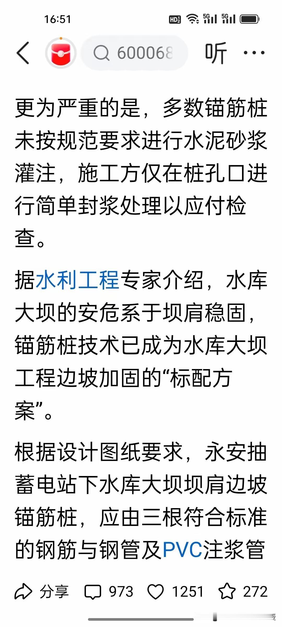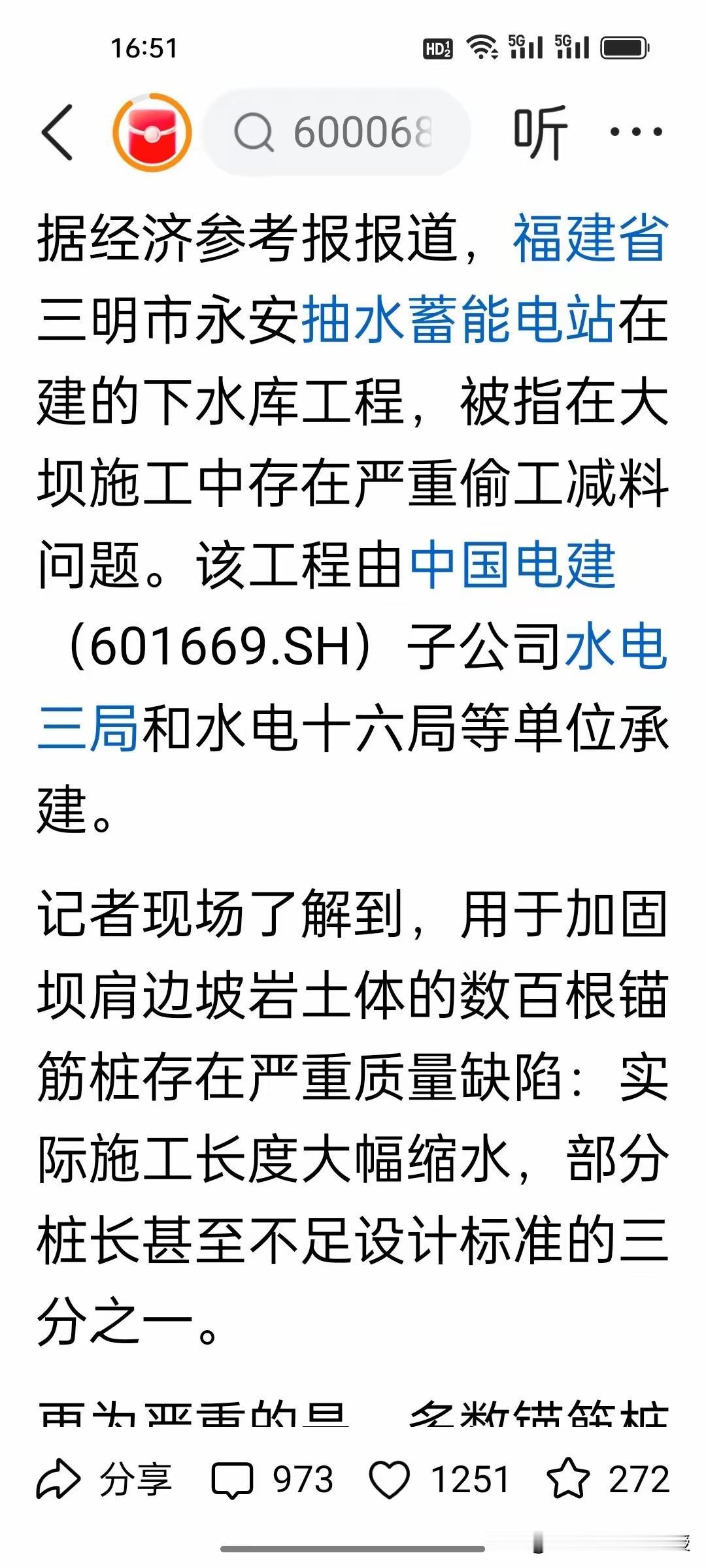 经济参考报记者确实是“吹哨人”,立了大功啊!这位记者亲自调查中国电建的福建三明市永安抽水蓄能电站在建的下水库75亿的工程项目涉嫌偷工减料,数百根锚筋桩存在严重质量缺陷。 说句心里话,看到这个新闻的时候,整个人都愣住了。一个动辄几十上百亿的大工程,关系着水利安全、区域电网稳定,说白了就是压在大家头顶上的“命根子”。结果被一线记者掀开盖子,发现这么一堆乱七八糟的问题,普通人哪能不心惊?尤其还是锚筋桩这种关键部位,质量要是真出了岔子,那可不是修补两桶砂浆能糊弄过去的。 更让人心里犯嘀咕的是,设计方、施工方和监理方居然都挂着“中国电建”这块牌子。这种“一个单位仨角色”的做法,在行业里都知道不合规,《建筑法》里也明明白白地写着不能这么干。可偏偏这样的大项目还是有人敢这么操作,真让人感叹一句:胆子也太肥了。 眼下中国电建还没发表什么正式说明,也没看到说成立调查组的消息。照理说,这种事一旦曝光,正常反应就是赶紧查、赶紧说清楚,不然舆论压力压着,连股民心里都得发毛。毕竟这是国家重点工程,谁都知道出不得半点问题,更不是哪个部门的自留地。要是基层单位有人真把大工程当提款机,那不仅是辜负了信任,也是把行业底线当橡皮泥捏。 不少投资者这两天估计也睡不好。中国电建的股价最近几个月本来就一路往下掉,跌得人心里直打鼓。这事一曝光,大家第一反应肯定是:完了,周一又得跟着遭殃。毕竟五十多万散户盯着这只股票,真跌下去,受伤的永远是普通人。说白了,一个新闻曝光,对应的不是一行文字,是一堆人的真金白银和生活压力。 话又说回来,记者这次算是真正做到了“吹哨人”的价值。现在互联网信息杂乱,大家对媒体的信任也被磨得差不多了。这时候愿意骑着摩托上山、背着设备下工地、冒着风险盯着问题细查的记者,确实难得。能把事情扒得清清楚楚,让公众看到真相,这种勇气本身就值得尊重。 而作为一家大央企,一旦事情曝光,越是躲着不回应,越会让大众不放心。大企业有的体量、资源、话语权都不小,越该在这种时候站出来把事情摁住。该怎么查、怎么整改、怎么处理责任人,都得拿个态度出来。就算最后证明里头还有误会,也得给公众一个踏实的说法。 事实上,工程质量的事从来不是小事情,尤其是抽水蓄能这种项目,一旦建成,几十年都摆在那里。别看现在省点钱、省点材料好像挺“聪明”,以后出事可就是天价甚至命的代价了。行业里谁不知道这一点?可仍然有人为了眼前利益伸手,这种现象要是真存在,就必须狠狠查、严格管。 大家也不是要看谁倒霉,也不是要唱衰企业。恰恰相反,公众更希望央企能挺住、能做标杆、能让人放心。这次曝光出来的问题,只要能把漏洞补上,把风险消掉,把制度理顺,那对行业反而是件好事。怕就怕睁一只眼闭一只眼,那问题永远是在地下发酵,等爆出来就已经太晚了。 工程关系民生,项目关系安全,企业关系信任。既然风暴点已经亮出来,是时候把该亮的亮一亮、该查的查一查、该说的说一说。遮着掩着只会让人越想越怕,透明才是最好的止损方式。