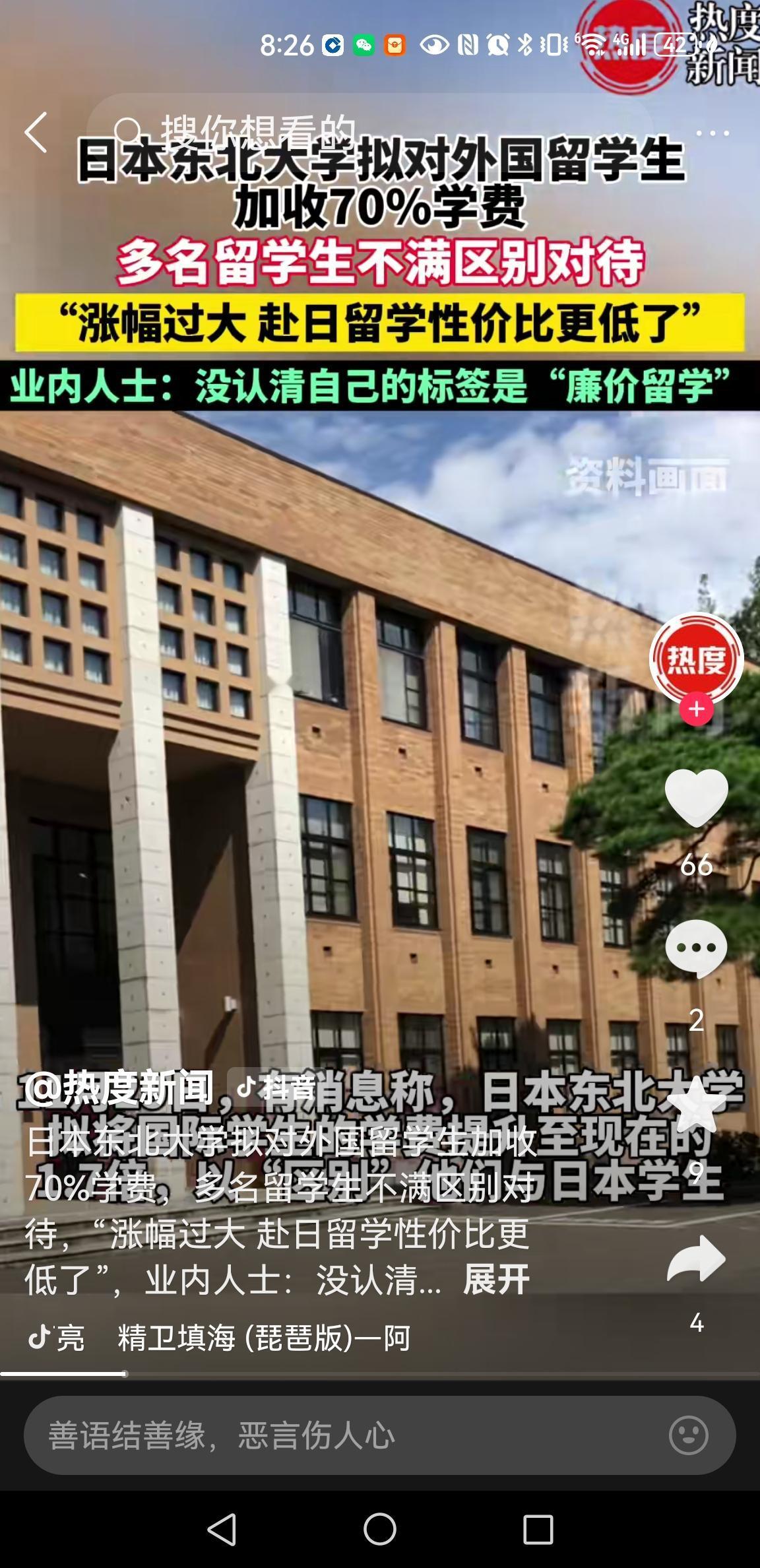 日本反制中国的板子,落在了12万留日学生的身上 近日,日本知名高校拟对外国留学生加收70%学费。冲上热搜 据悉,日本东北大学。 拟将国际学生的学费提升至现在的1.7倍,以“区别”他们与日本学生。 目前,在日本的中国留学生总数为123485人,占在日留学生总数的约36.7% 日本知名大学这样搞,主要针对谁?中国人心知肚明。 日本东北大学提高留学生学费,这可能只是开了个头,紧接着日本其他大学也会跟风效仿。 说个大白话,人家日本就是不欢迎你中国留学生!提高学费,你交的起就上,嫌贵就回老家。 呼吁: 中国也“以其人之道,还治其人之身。“,提高日本在华留学生的学费! 雪山崩塌的时候,没有一片雪花是无辜的。 中日交恶,关键时刻,国家的立场,就是我们14亿中国人的立场!