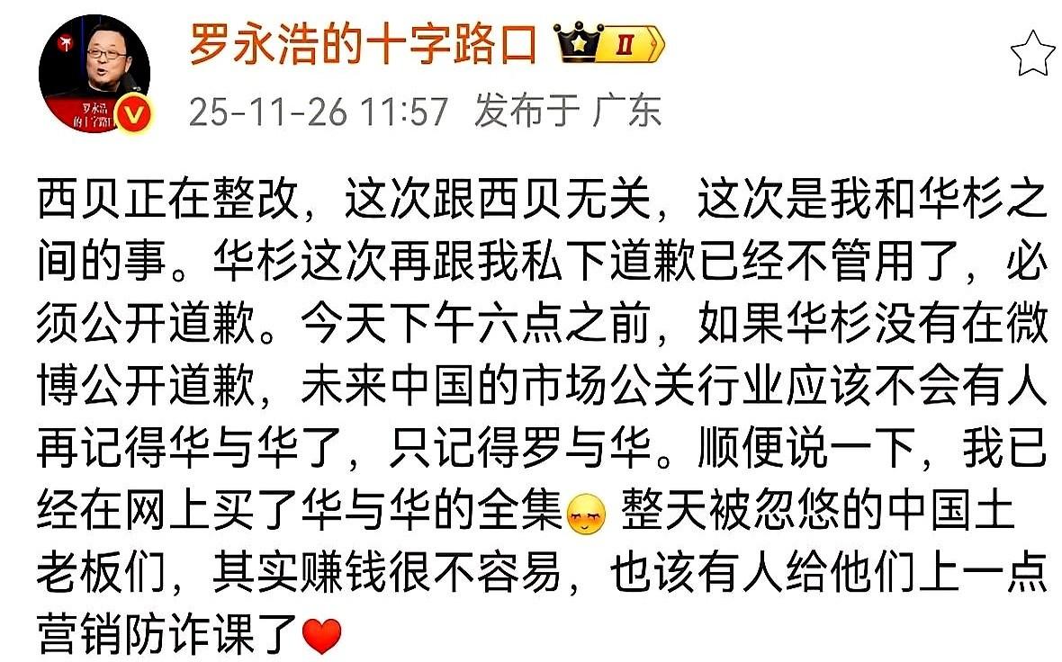 老罗那边,六点的钟声敲完了。 华杉这边呢?静悄悄。 我手机都快刷冒烟了,就等着看道歉信长啥样。结果,啥也没有。 这哪是两个大佬的私人恩怨啊。 这分明就是一堂,由老罗主讲,价值连城的“营销防诈”公开课。全网免费旁听。 一个体面人,最怕什么? 最怕被另一个更较真的体面人,摁在地上,把他那些云里雾里的“方法论”一件件扒光,还全网直播。 太狠了,也太过瘾了。 说真的,这些年,多少公司,多少老板,被那些所谓的“大师”给忽悠瘸了? 花了真金白银,请来一尊神,结果发现是个泥菩萨,自己过河都费劲。 你还不能说,说了显得你没悟性,不懂“顶层设计”。 但他们偏偏碰上了老罗。 一个骨子里有洁癖的产品经理。你跟他谈“感觉”,他跟你抠“像素”。你跟他讲“势能”,他直接问你“数据来源”。 你玩虚的,他就掀桌子。 所以啊,现在道不道歉,已经没那么重要了。 重要的是,皇帝的新衣,终于有人站出来给扯下来了。 这堂课的名字,我都想好了,就叫—— 《出来混,迟早要还的》。
