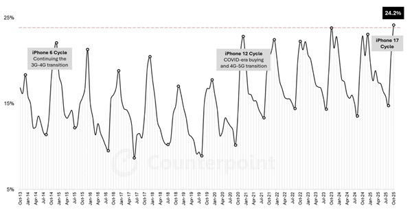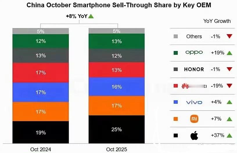 10 月算是神仙打架的一个月,这个月苹果小米OPPO vivo 都出现了增长。苹果大月,不奇怪,也是 iPhone 17 系列卖的真好,华为没啥新品,份额掉的最多。 苹果10月全球手机份额飙至24.2%