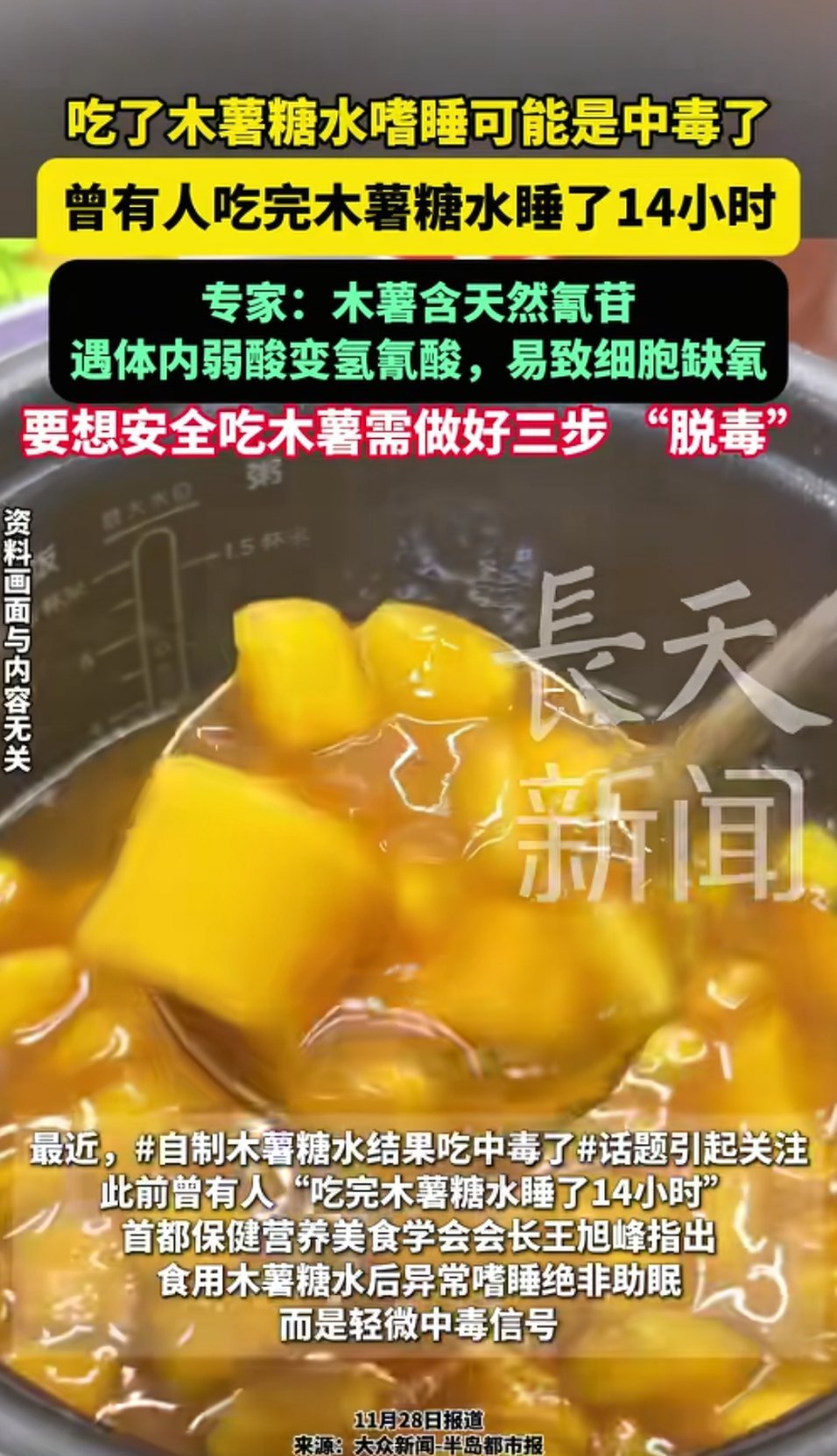 网红老人去世粉丝怀疑因木薯糖水中毒: 怪不得古茗只放两块 ,防止中毒呢,这种黄心木薯没毒,我们这满大街糖水店都是木薯糖水。白色那种才有毒