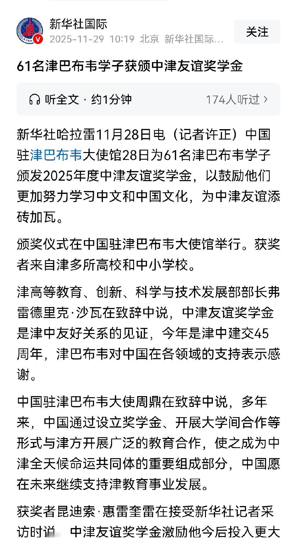 中国驻津巴布韦大使馆在津巴布韦给津巴布学子颁发中津友谊奖学金。我们不仅广泛接纳来自非洲的留学生,而且也在国外设立类似的奖学金,奖励为宣传中国文化、学习中国文化的学子和人士。 很多人认为,与其这样,还不如多给国内贫困大学生一些资助。但是这些都是很有必要的,我们资助国外喜欢并且传播中国文化的青年,就是在资助那些愿意替中国说好话的外国人,也就是培养亲中派,这是非常非常有必要的。 而对国内大学生我们早有成熟的奖助体系,对贫困人口我们完成了脱贫攻坚工作,对返贫人口,我们也有对应措施。 国内国外,我们两手都要抓,两手都要硬!