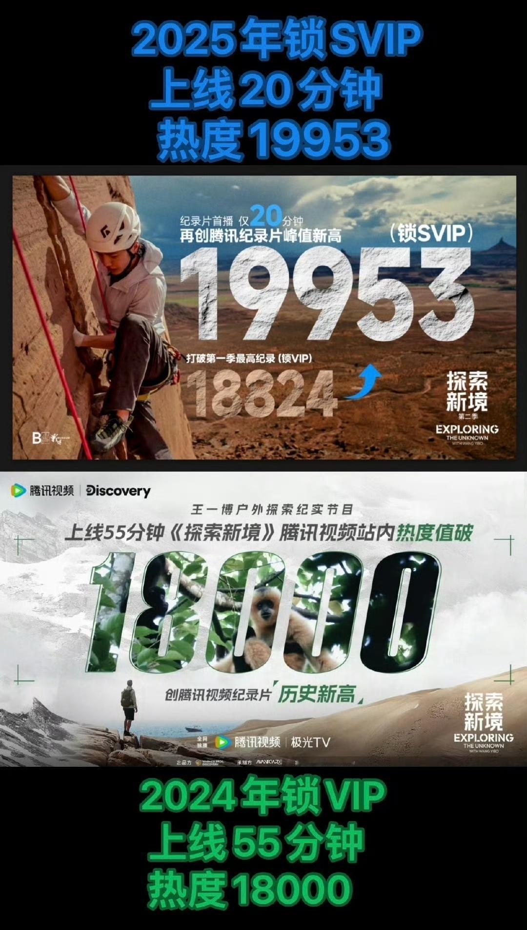 如果你知道这是一部纪录片; 如果你知道这是一部个人ip的户外探索纪实纪录片; 如果你更知道这是一部工作日上午11点开播,并且锁定svip的纪录片…… 你就会懂得这两张图的含金量[赞]。 王一博自己的《探索新境》,打破自己的记录,再创腾讯纪录片峰值新高😎。 王一博 王一博探索新境2