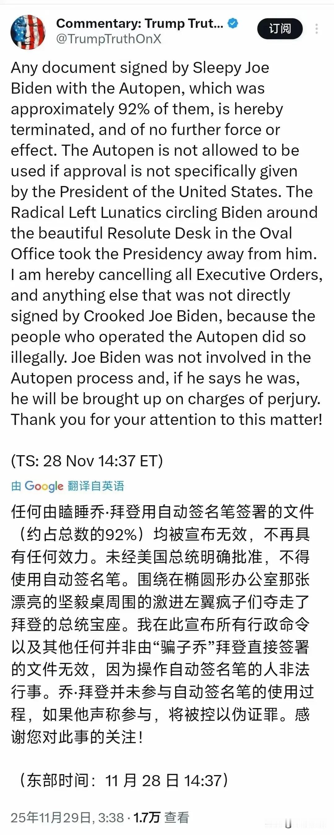 特朗普又把矛头指向了拜登! 特朗普在媒体平台上发文,再次指责拜登使用自动签名笔,说是拜登签署的文件有92%是使用自动签名笔签的,他宣布这些文件都无效。 特朗普还说,如果拜登声称这些签名是他批准的,他参与了,那他还将被控以伪证罪。 总之,拜登签署的92%文件无效!他想解释那他就有罪!这次他还将拜登外号在“瞌睡乔”的基础上,又增加了一个“骗子乔”。