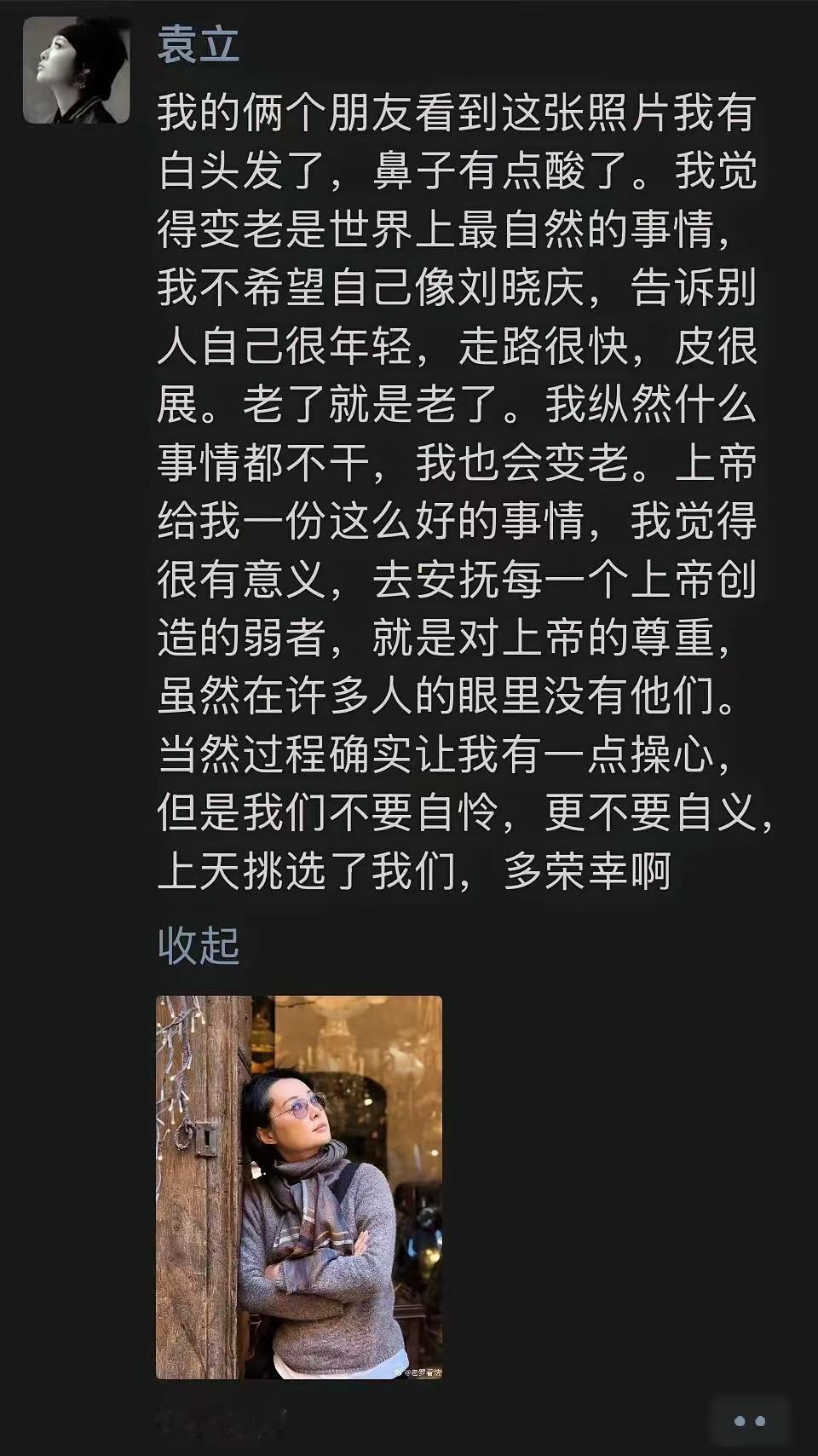 袁立说:我的俩个朋友看到这张照片我有白头发了,鼻子有点酸了。说的挺好的,但不要提别人名字,因为每个人都有自己的生活方式……很多时候别人的事你不赞同,但也要理解,尊重……这世界很大,人很多,求同存异。 说自己就行了,晓庆老师没惹你。踩别人是为了抬高自己,但网友看到的是踩别人拉低了自己! 她的麻烦都在嘴上,抬高自己贬低别人。年轻态是全方位的,晓庆值得拥有不是吗? 同感:点名道姓不恰当! 你做你的,刘晓庆做刘晓庆的,你有你的观,刘晓庆有刘晓庆的观。 这袁立的情商堪忧,干嘛要提一嘴庆姐,你做好自己就是了。 非得带上刘晓庆,刘晓庆比她大那么多可以说是业界前辈,一点尊敬都没有,关键是人家就是走路快。