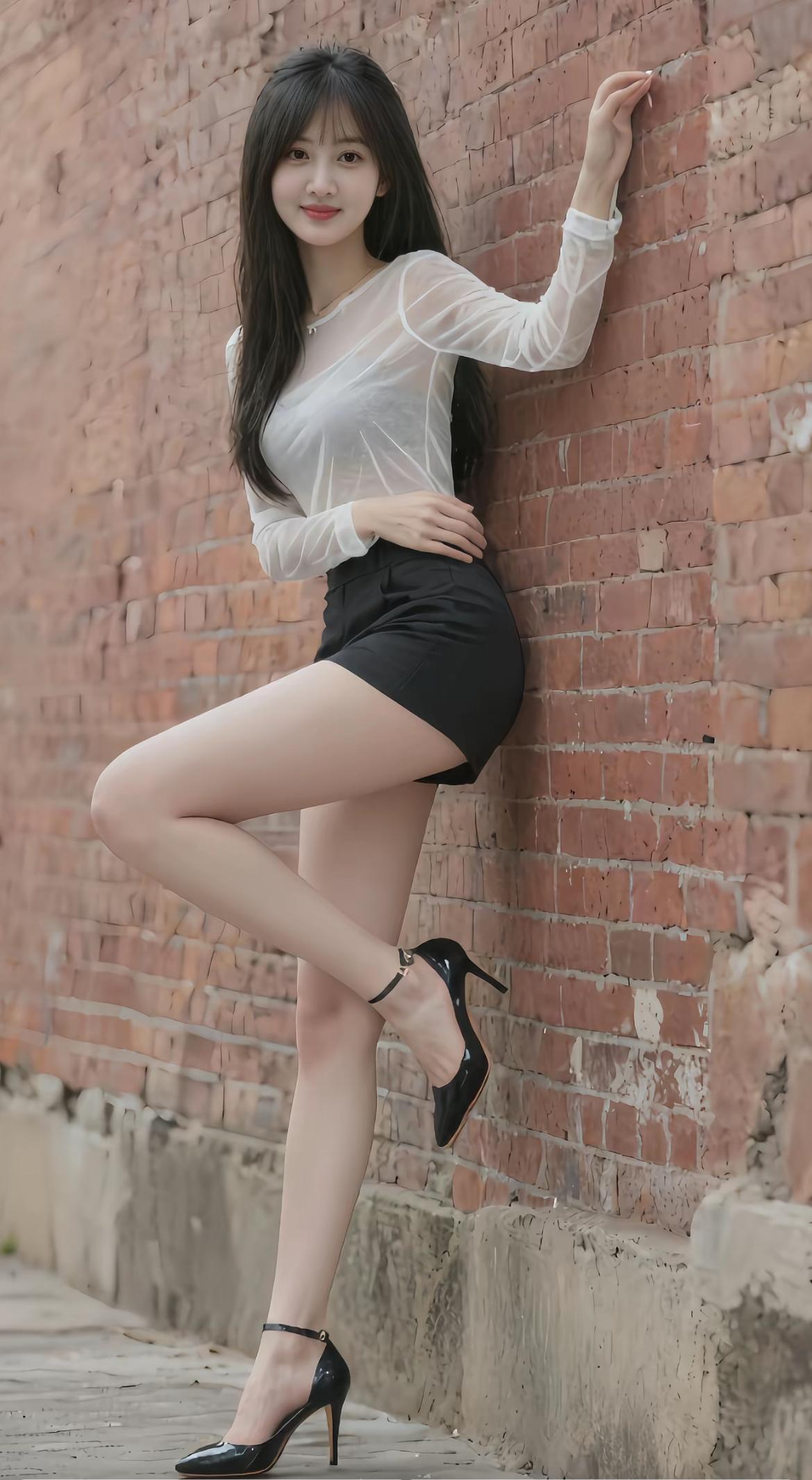 一个美女靠墙摆姿势,穿着高跟鞋。