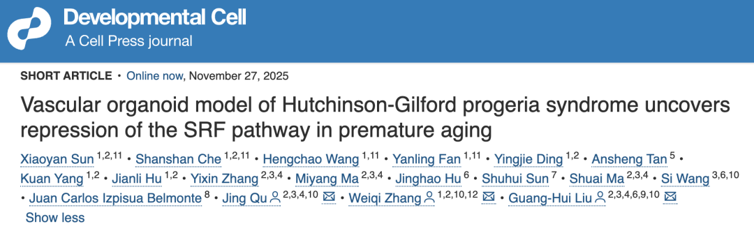 近日,刘光慧研究员与中国科学院北京基因组研究所张维绮研究员合作,在DevelopmentalCell杂志发表了题为“VascularorganoidmodelofHutchinson-GilfordprogeriasyndromeuncoversrepressionoftheSRFpathwayinprematureaging”的研究论文。