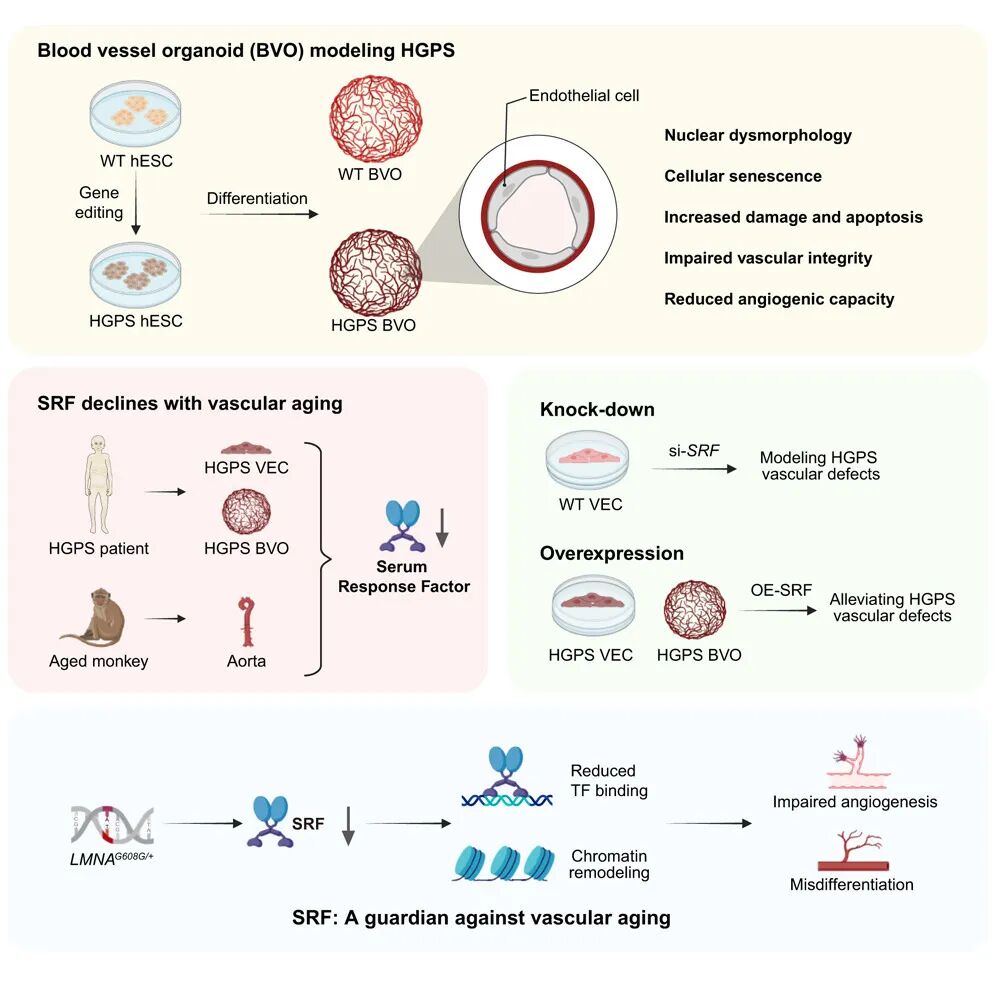 该研究利用基因编辑和人多能干细胞定向分化技术,首次成功构建了模拟HGPS的人类血管类器官(BloodVesselOrganoid,BVO)模型。该模型在三维尺度上高度重现了HGPS患者血管系统的多种病理特征。通过多组学整合分析,研究揭示了转录因子SRF(SerumResponseFactor)的表达下调是驱动血管早衰的一个核心事件,为干预衰老相关心血管疾病提供了新的潜在靶点。