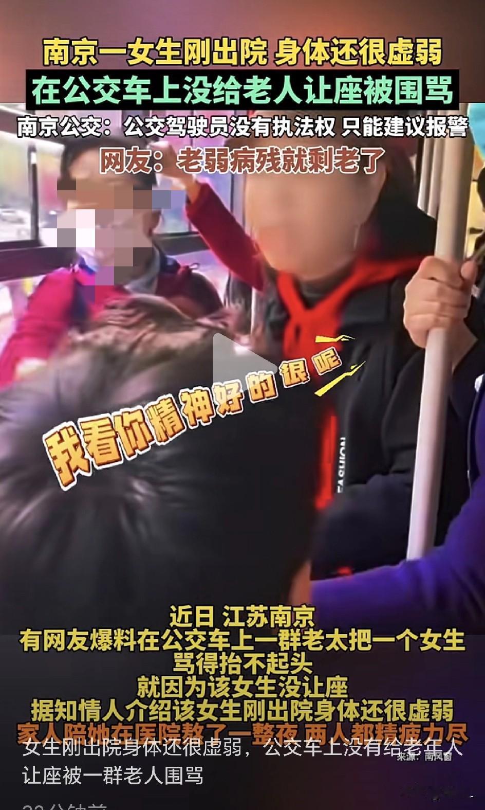 南京公交“让座风波”引热议:虚弱的女生VS围骂的老人,谁之过?网友:老弱病残只剩“老”了? “你凭什么不让座?”、“现在的年轻人真没礼貌!” 11月27日,江苏南京的一辆公交车上,一场关于“让座”的激烈争吵打破了车厢的安静。 一名刚出院、身体虚弱的女生,因为未能给一群老年人让座,竟遭到了对方集体的指责和辱骂。 据说女生和家人在医院熬了整整一宿,刚刚办理完出院手续。上车后,她疲惫地坐在座位上,希望能稍作休息。 然而,一群上车的老年人,看她不主动站起来让座,就张口要求她让座。 在女生解释自己身体不舒服后,这些精神抖擞的老人们非但没表现出理解,反而更加情绪激动地围住她,你一言我一语地指责她“不尊老”、“没家教”,甚至有人怒斥她:“装什么病!” 现场有看不过眼的乘客出面为女生辩解,同样遭到了这群老人的辱骂。整个过程中,车厢内充满了火药味,而虚弱的女生在围攻下显得孤立无援。 全车人都能看出来女生的虚弱和不适,唯有这些“饱经风霜”的老人们指责她在“装”。 事情发生后,有媒体向公交集团求证。得到的回应是:驾驶员没有执法权,遇到此类纠纷,建议乘客直接拨打110报警处理。 这个回应,不由得让人一阵心塞。 “尊老”是传统美德,但尊老和爱幼是并列存在的,车厢让座,对应的是老幼病残孕,而不是只有一个“老”字。 况且,视频中的老人们,声音洪亮,气势十足,看上去可比女生不知道要精神抖擞多少倍。 而公交车上那么多人,这些老人们专围着女孩谩骂要求让座,说白了,不就看着女孩好欺负,柿子专拣软的捏吗? 视频很快冲上了热搜,在网络上引发热议,绝大多数网友的观点呈现出一边倒的趋势: “让座是情分,不让是本分!道德是用来约束自己的,不是用来绑架别人的。” “老人们,请你们也爱爱幼吧!年轻人生活压力大,通宵从医院出来,比谁都难。” “看得人来气!真正需要座位的是那个虚弱的女孩,而不是倚老卖老、精力充沛到能骂街的人。” “司机也很难,确实没权力处理。支持报警,让法律来界定是非。” “这不是尊老,这是欺幼!谁弱谁有理的风气该改改了。” “超市抢鸡蛋的时候一个个生龙活虎的。” “新闻上天天都说女孩被老人集体骂不让座,那怎么没看到新闻上说,老人看着年轻的男人不让座骂座,感情是看谁软弱骂谁是吧。” 一场公交让座风波,照出了人情冷暖,也折射出社会观念的变迁。 没有什么是应当应份的,善良与体谅应该是双向的,年轻人应该尊敬长者,而长者也应体恤年轻人的不易。 真正的文明,不是强硬地要求别人遵守规则,而是发自内心的彼此关怀与尊重。 屏幕前的你怎么看这场“让座风波”?如果你在现场,你会怎么做? 信息来源于这里是鞍山,侵联删!