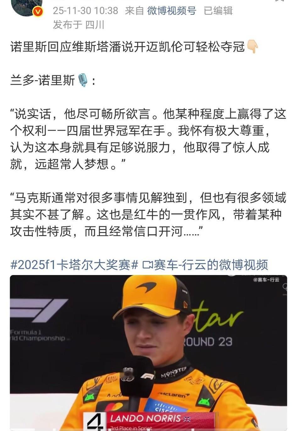 维斯塔潘:如果我开迈凯伦,冠军已经到手了。 诺里斯回应维斯塔潘说开迈凯伦可轻松夺冠:“说实话,他尽可畅所欲言……”