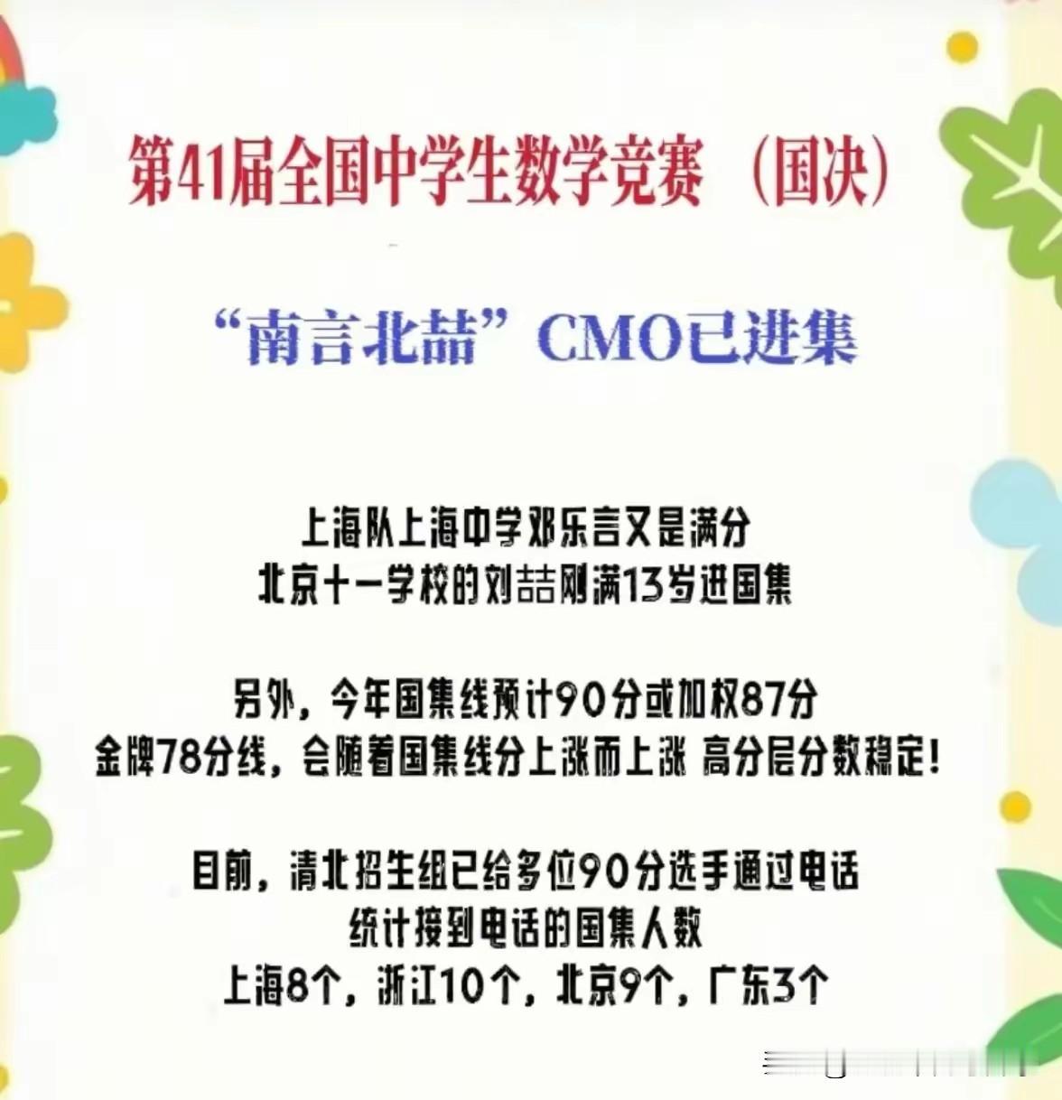 2025CMO国集又被湖北、浙江、北京,上海瓜分,据说湖北已经有11个国集了, 湖北的数学竞赛从小学开始抓, 如今国集的对于在小学二、三年级, 就已经是各大机构如雷贯耳的存在。 数学竞赛拼天赋也拼努力, 看起来南言北喆的神话, 除了他们天赋异禀, 也离不开他们父母的超前的规划。 天才固然存在,天赋固然重要, 可是也不要忽略天才背后超出常人的努力, 和常年枯燥的反复的刷题的背后的艰辛, 学习本质就是一个不断淘汰的过程。 淘汰没有天赋的,淘汰学习习惯不好的, 淘汰没有坚持的,淘汰不能专注目标的。 学习的本质就是一场筛选, 而最终留下幸运儿一定有超乎常人的能力。 很多人诟病数学竞赛的选拔机制, 觉得这学的和最终运用无关, 可作为一场筛选,总要有个规则, 在没有更好的规则下,这就是好规则。 北大昨天在现场招人更受青睐, 清华能吸引数竞国集的只有姚班。 底层逻辑在于本科数学的背景, 不管今后从事什么工作都是有帮助的。 北大光华清华经管院长本科都是学数学的。 2012--2015年共产生6位, 世界计算机最高奖图灵奖, 其中5位本科或博士都是数学专业的。 特别需要指出的是, 他们在各自读书时代已经有计算机专业了。 兰普森(图灵奖得主)“并不认为每个人都要选择IT专业”。 事实上,他自己的经验表明: 有些学生的本科专业为数学、 物理或其他一些有智力深度的领域, 他们在攻读计算机博士学位时的表现, 往往强于一直研修IT专业的学生。 至于IT在科学、工程或商务领域的应用, 拥有相关应用领域的强大背景知识, 显得更为重要。