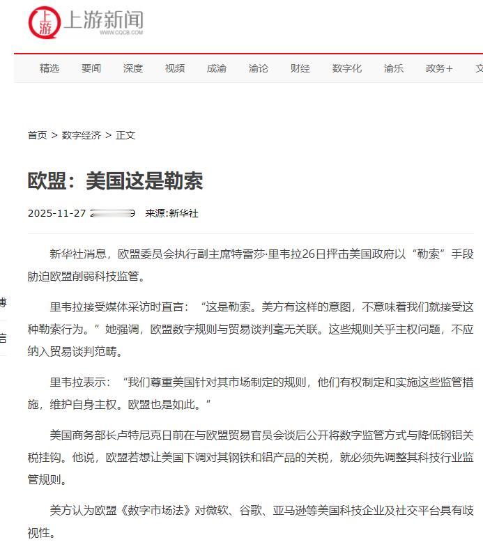 美欧彻底决裂?欧盟忍无可忍,直接怒怼美国!“这根本就是赤裸裸的勒索,欧盟绝不会为了关税减免就出卖自己的监管主权。”当地时间11月26日,欧盟负责反垄断事务的执行副主席特蕾莎·里贝拉怒批美国,这番表态直指美国商务部长卢特尼克两天前的要挟,以调整对欧钢铝关税为条件,逼迫欧盟放宽数字监管规则。 美国的做法不仅蛮横,更触碰了多边贸易体系底线。根据WTO《关税及贸易总协定》相关规定,成员方不得将非贸易议题与关税不正当捆绑,更不能以关税胁迫他国改变国内监管政策。 这种“以贸易利益换监管让步”的操作,本质上是将本土产业诉求凌驾于国际规则之上,也难怪里贝拉会用“勒索”定性。 欧盟的强硬反击并非临时起意,而是其“数字单一市场”战略的必然坚守。DMA和DSA作为该战略的核心支柱,是欧盟维护数字市场公平、培育本土产业的关键。 背后更有美欧数字产业基础的巨大差异作祟:美国科技巨头占据全球数字服务市场62%的份额,欧盟市场是其核心营收来源;而欧盟本土数字企业全球份额仅18%,监管是其重要保护屏障。 美国的施压还暴露双重标准,自身频繁对本土科技巨头发起反垄断调查,却将欧盟同类监管斥为“歧视性政策”。 反观欧盟,其立场得到内部广泛支持,78%的民众认同加强科技企业监管,65%的本土中小企业认为DMA有助于改善竞争环境,这为里贝拉的强硬表态筑牢了民意基础。 国际社会也对美国的胁迫逻辑表达警惕,联合国贸发会议明确指出,贸易胁迫干涉监管主权不利于全球数字经济稳定。 多个新兴市场国家认同“监管主权平等”,里贝拉的表态实则代表了反对“数字监管霸权”的普遍声音。 归根结底,这场争端是两种数字经济发展模式的碰撞。美国推行“市场主导+弱监管”模式,试图通过胁迫输出自身理念;欧盟坚持“监管引导+公平竞争”,捍卫发展路径选择权。 里贝拉的“勒索”之斥,不仅是对贸易胁迫的反击,更是对国家主权的坚守。这一争端也警示全球,唯有尊重各国监管主权、通过协商构建多元治理规则,才能让数字经济健康发展。
