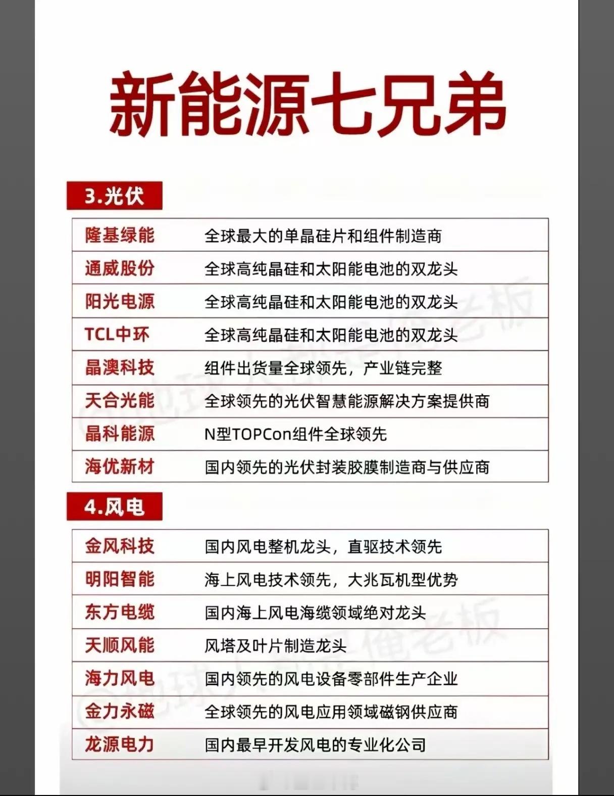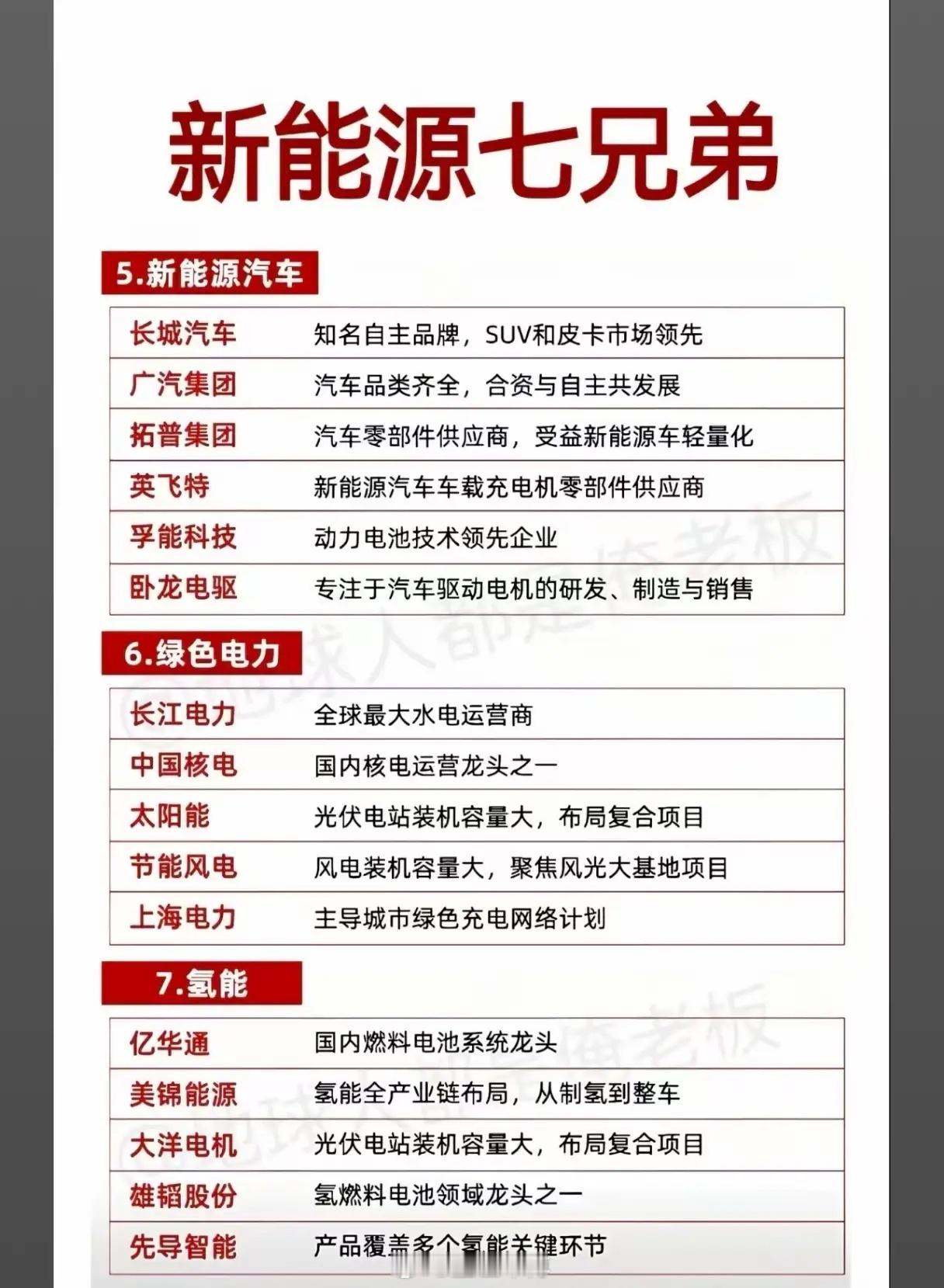 “新能源七兄弟”到底是谁?这7大赛道的龙头企业,早被行业内行人盯紧了你知道新能源产业链里,哪些企业是真正的“隐形王者”吗?近期被热议的“新能源七兄弟”,其实是锂电池、储能、光伏等7大赛道的核心玩家集群。锂电池领域,宁德时代稳坐全球动力电池头把交椅,比亚迪凭全产业链优势双线领跑;储能赛道里,派能科技占海外户储半壁江山,南网储能靠抽水蓄能装机量稳居前列;光伏圈的隆基绿能、通威股份,是单晶硅片与高纯晶硅的双料龙头;风电的金风科技、明阳智能,分别在陆上直驱与海上大兆瓦机型中领跑。新能源汽车、绿电、氢能赛道同样藏龙卧虎:长城汽车霸榜SUV市场,美锦能源布局氢能全产业链,长江电力是全球最大水电运营商……这些企业覆盖了从材料、设备到终端应用的全环节,既是行业技术突破的主力,也是产业链稳定的压舱石。