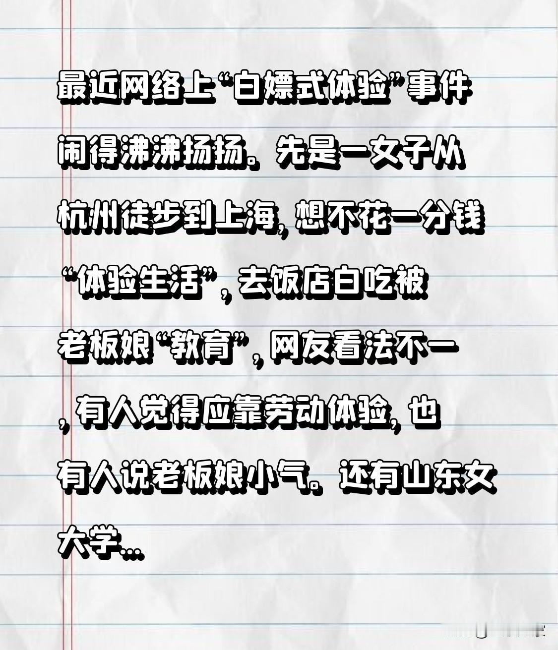 最近网络上“白嫖式体验”事件闹得沸沸扬扬。先是一女子从杭州徒步到上海,想不花一分