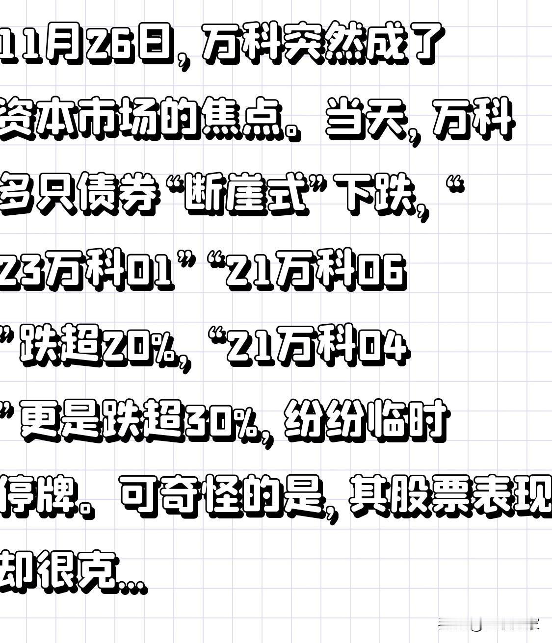 11月26日,万科突然成了资本市场的焦点。当天,万科多只债券“断崖式”下跌,“23万科01”“21万科06”跌超20%,“21万科04”更是跌超30%,纷纷临时停牌。可奇怪的是,其股票表现却很克制,港股万科企业跌6.28%,A股万科A仅跌2.48%。 这场“做空”的源头,竟是美国数据商Octus的一则传闻,说中央指示深圳以“市场化方式”处理万科债务。但这只是传闻,尚无权威通报。要知道,“市场化方式”在2024年3月住建部部长就提过,针对的是严重资不抵债的房企。 万科这次被“做空”背后究竟是啥情况?是市场过度反应,还是真有隐情?万科能否化解这次危机?后续大股东又会有啥动作? 万科 万科企业危机 万科市值 万科资金链 万科债务 万科 万科资金困局 万科企业危机 万科市值 万科债务 万科楼盘 万科发展史