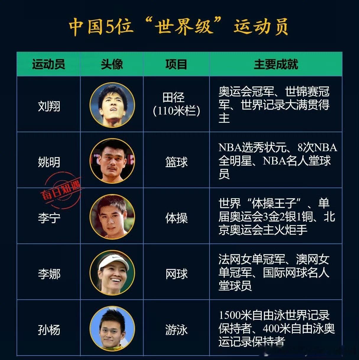 中国5为世界级运动员,是不是还遗漏了谁?