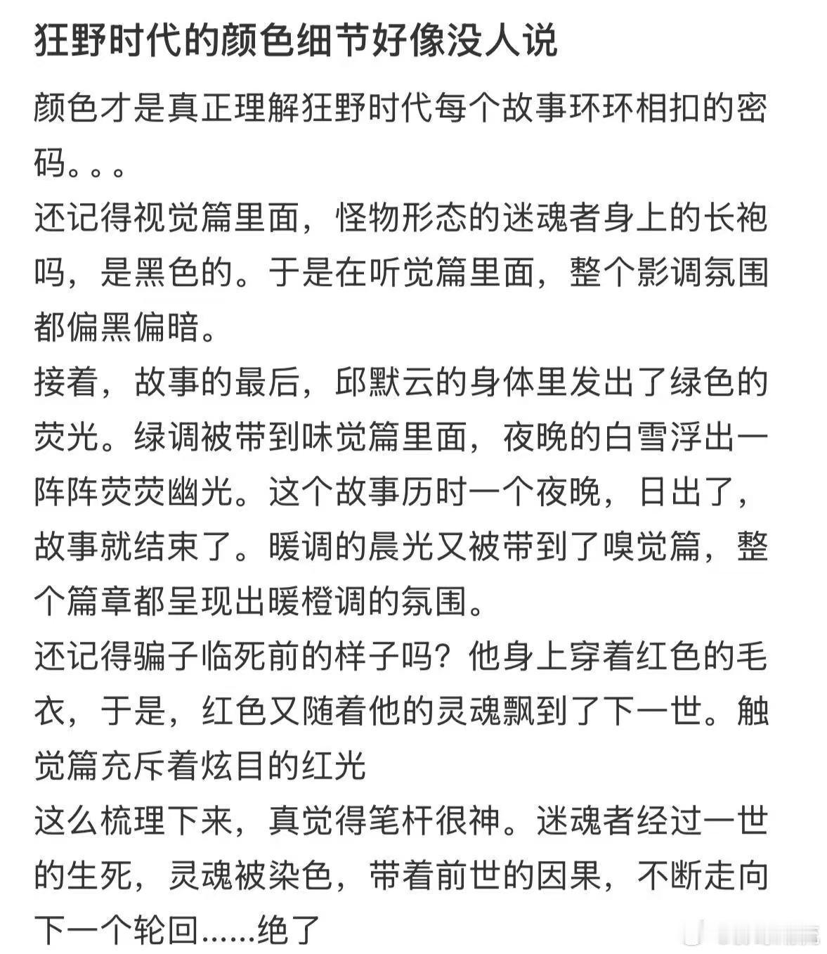 狂野时代细节挖不完根本挖不完 从视觉到触觉,细节环环相扣,每一篇章都埋下了伏笔,回味无穷,真的让人想再看一次,细细品味那些藏在梦中的秘密。