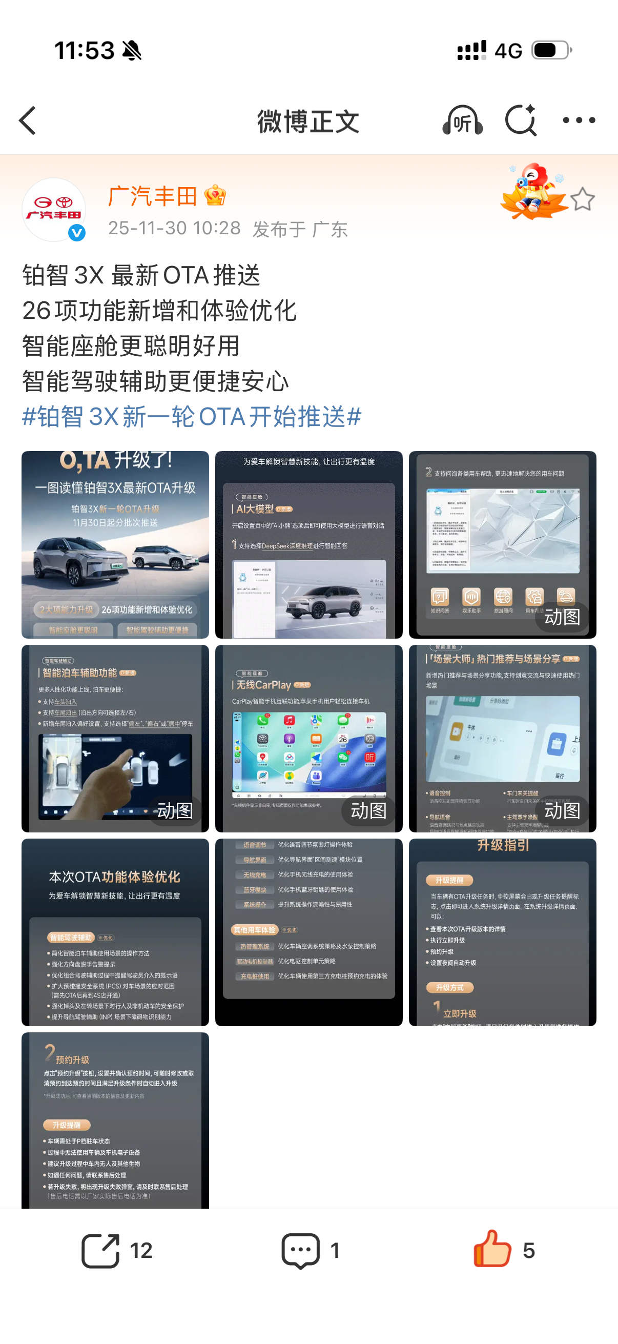 铂智3X年度重磅OTA正式推送这次OTA有三个关键词:解痛点、提效率、真升级。🌟车头泊出:终于把“窄车位挤不出来”的通勤噩梦解决了,这是补过去智能泊车的短板,而不是装花里胡哨的功能。🌟AI大模型上车:车机再也不是“听不懂人话”的老古董了,智能交互跟得上潮流,甚至有点“越级打新势力”的意思。🌟CarPlay补齐生态:一句话——用户早就想要,厂商终于补上。体验优先,而不是强推自家系统。更关键的是,广丰这次把自己和新势力拉到同一张桌子上比拼体验和迭代速度,而且丝毫不虚。甚至在一些核心体验上,还真有点领先的味道。最后不得不提:三担责。电池自燃担责、智能泊车事故担责、电池衰减担责——这不是喊口号,是大厂敢负责的底气。在卷智能、卷体验的时代,铂智3X选择卷“确定性”。而这种踏实带来的安心感,其实更难替代。