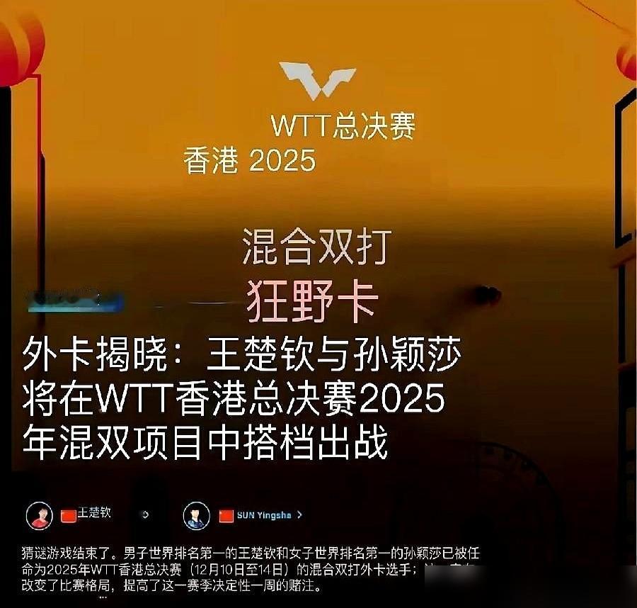 别猜了,散了吧。 香港总决赛那张混双票,除了塞给孙颖莎和王楚钦,还能给谁? 总决赛130万美元的奖金池需要顶级流量撬动,而数据显示,有他们出场的混双决赛,门票溢价能冲到30%以上。 短视频平台50亿次的播放量像海啸一样,把冷冰冰的参赛规则冲开了一道口子。 商业逻辑就这么赤裸,与其守着僵化的条例,不如让最能点燃赛场的人站上球台。 默契这东西,在他们身上已经长成了肌肉记忆。 国际乒联的技术报告冷冰冰地写着92.7%的战术同步率,可球迷眼里看到的,是王楚钦反手拧拉时孙颖莎早已侧身让出的进攻线路,是球还没过网两人脚步已经同步移动的预判。 每天清晨六点的“无声训练”里,他们靠眼神和手势搭建起一套密电码。 高速摄像机捕捉到那些细节,王楚钦球拍角度误差不超过2度,孙颖莎正手快带的落点偏差控制在15厘米内,这种精确到毫米的配合,是八年时间一拍拍磨出来的结晶。 最让人头皮发麻的,是巴黎奥运决胜局那个闭眼击出的擦边球。 那不是运气,是蒙眼“盲打训练”淬炼出的神经反射。 当对手还在依赖视觉判断时,他们已经把击球节奏刻进了听觉和触觉里。 这种近乎变态的训练方式,锻造出混双赛场上罕见的“量子纠缠”效应。 林诗栋/蒯曼的青春风暴再猛烈,松岛辉空/张本美和的搏杀再凶悍,在这种经历过生死局的绝对默契面前,总显得差了点火候。 当然,外卡也是烫手的。 5天15场三线作战,平均每天3场高强度对抗,这是要把人榨干的节奏。 但你看他们什么时候喊过累? 全年无休的魔鬼赛程里,网上泼的脏水比训练时的汗水还多,可他们站在球台前,眼神里的光从来没暗过。 这种“扛事儿”的能力,比冠军奖杯更珍贵,它让每个被生活压得喘不过气的普通人,在深夜的直播画面里找到一束光。 现在,压力全甩给了对手。 日本组合和韩国队原本精心准备的“田忌赛马”策略彻底报废。 本来只需研究林诗栋/蒯曼一套战术,现在突然要面对两种截然不同的体系,一对是年轻气盛的快攻旋风,另一对是密不透风的控制大师。 小组赛就可能变成提前上演的决战,这出戏可比按部就班的晋级刺激多了。 所以别再争论什么特权不特权了。 体育竞技早过了唯金牌论的时代,人们更想看到的是灵魂与灵魂的共振。 当那个手伤退役的外国姑娘,看着莎莎在赛场上替自己延续梦想时,这项运动的价值已经超越了输赢。 这张外卡,说到底是我们所有人写给热血青春的一封情书。 既然躲不掉风暴,就干脆做席卷风暴的人,香港的球台等着你们把它点燃。