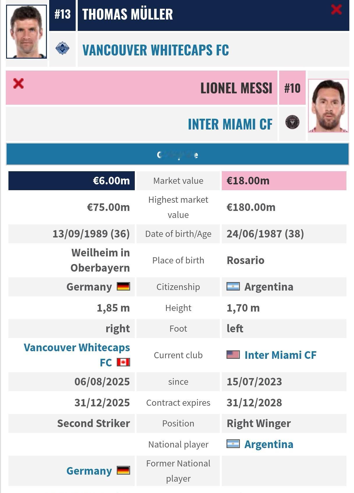 随着温哥华白浪3-1击败圣地亚哥,今年美职联季后赛的决赛将迎来一次经典对决——梅西 VS 穆勒!两位传奇球星的对决无疑会给这场决赛带来更多的关注! 穆勒在对阵圣地亚哥的比赛中表现一般,在球场上甚至滑倒了一次,但他对阵梅西的记录却很出色!梅西和穆勒代表不同的球队总共相遇过十次,穆勒所在的球队赢得了其中的七场比赛,其中包括2014年的世界杯决赛和拜仁在2020年欧冠半决赛中8-2大胜巴萨的比赛!梅西赢球的三场比赛,两次是德国与阿根廷的友谊赛,一次是14/15赛季欧冠半决赛巴萨3-0拜仁! 比起媒体和球迷,当事人显然要冷静的多,穆勒赛后说道:“这不是梅西对穆勒,这是迈阿密国际对阵温哥华白浪!他们可能更依赖梅西,而我们是一个很好的团队。你可以在今天的球场上看到,我们在进攻和防守上做的都很好!”尽管如此,穆勒也意识到这场比赛将引起重大关注。他说道:“当你有这样的对阵时,人们会观看,当有更多的人观看时,那么球员、球队的价值就会更大!这是MLS杯的决赛,但如果是与这些大牌球员在一起,那么整个足球世界都会更加令人兴奋。这对每个参与的人都是完美的情况!” 梅西已经拿了所有能拿的冠军,包括个人荣誉的大满贯,并没有太多遗憾,来美职联主要是为了养老,但一不小心就把垫底队带到了决赛的舞台!穆勒做为德国和拜仁的传奇球星,职业生涯除了欧洲杯能拿的冠军也都拿了,也没什么遗憾,美职联对他而言也就是职业生涯末期的一种尝试罢了!所以说从心态上讲,这场决赛梅西和穆勒都没有太大的压力,但愿这种心态能让球迷看到一场精彩的比赛!