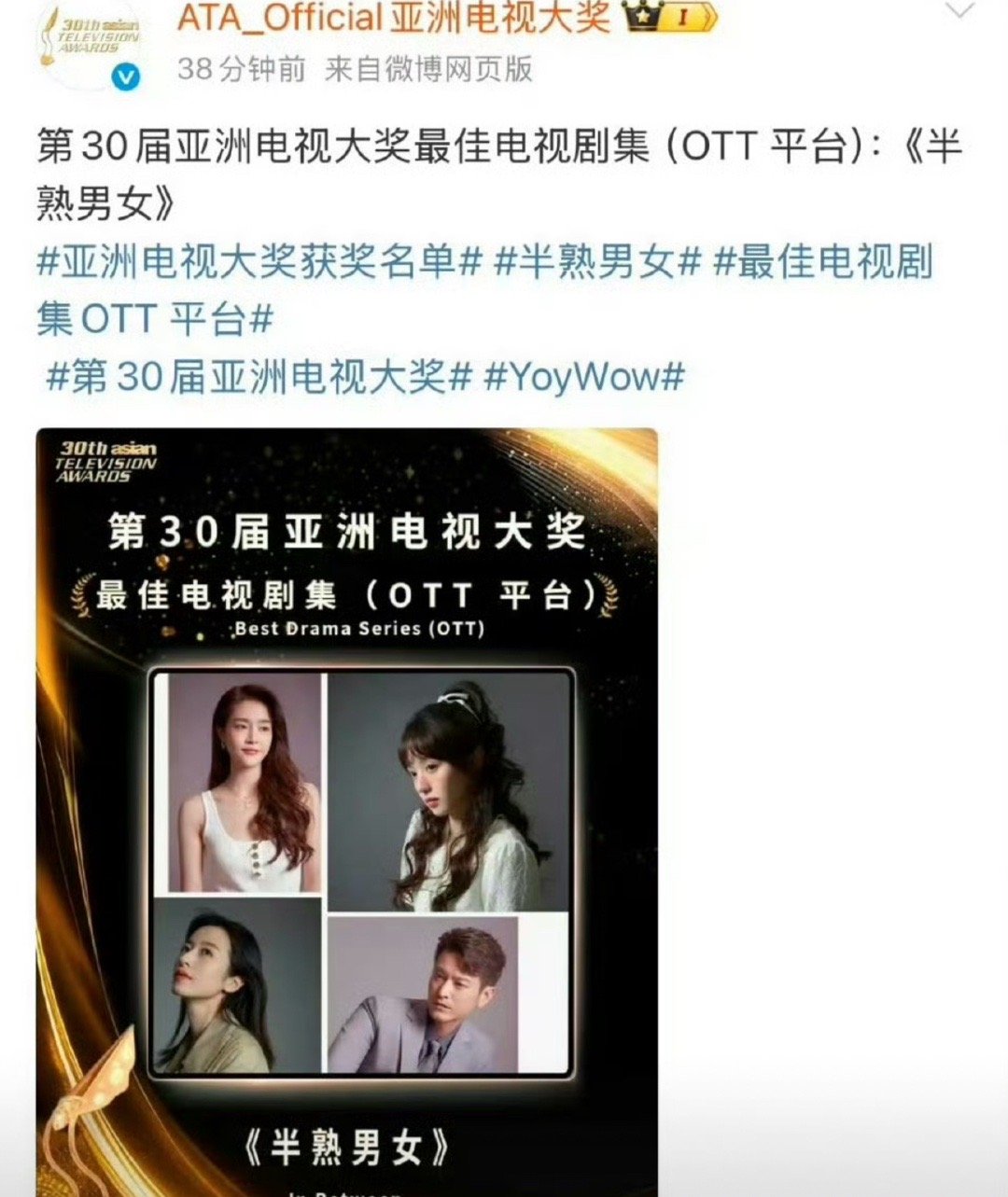 田曦薇半熟男女拿下亚洲电视大奖最佳电视剧小田也是扛剧花了