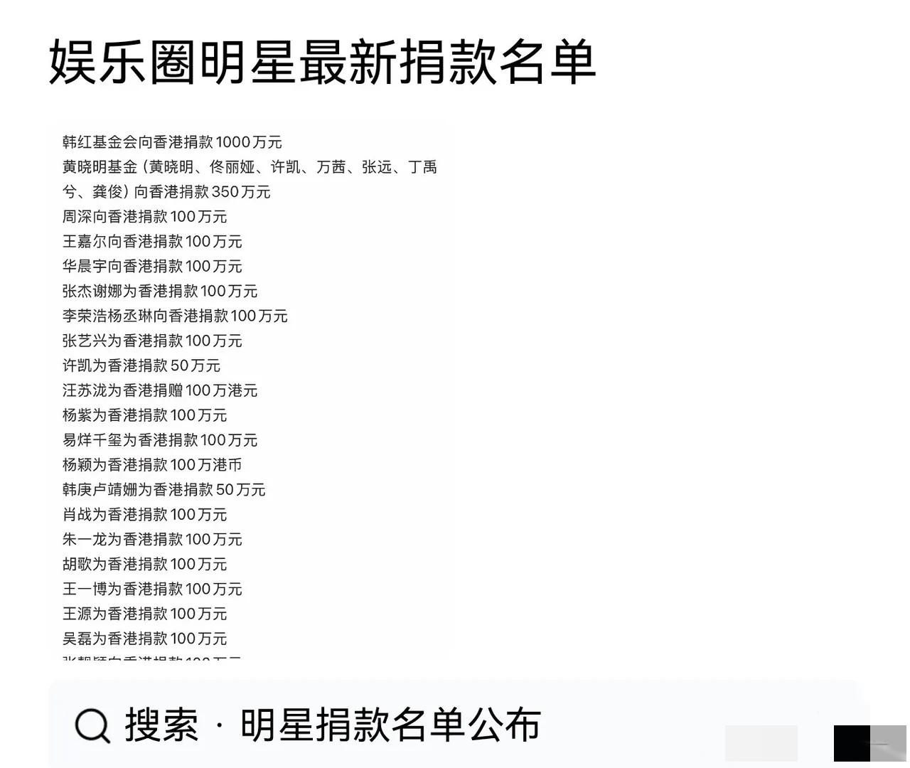 各路明星的捐款名单。准不准确不知道,来自于网图。 TVB老艺人也举办晚会筹款,金额超一亿港元。TVB的艺人举办晚会,筹集善款。捐款突破一亿港元。好久没有打开电视机,这里面的新面孔都不认识。汪明荃,肥妈。剩下的都不认识了。有男演员,老了,只看着面熟,叫不出名字。 其实明星现在演电视剧都没有人看,综艺还好一些。 感谢他们。