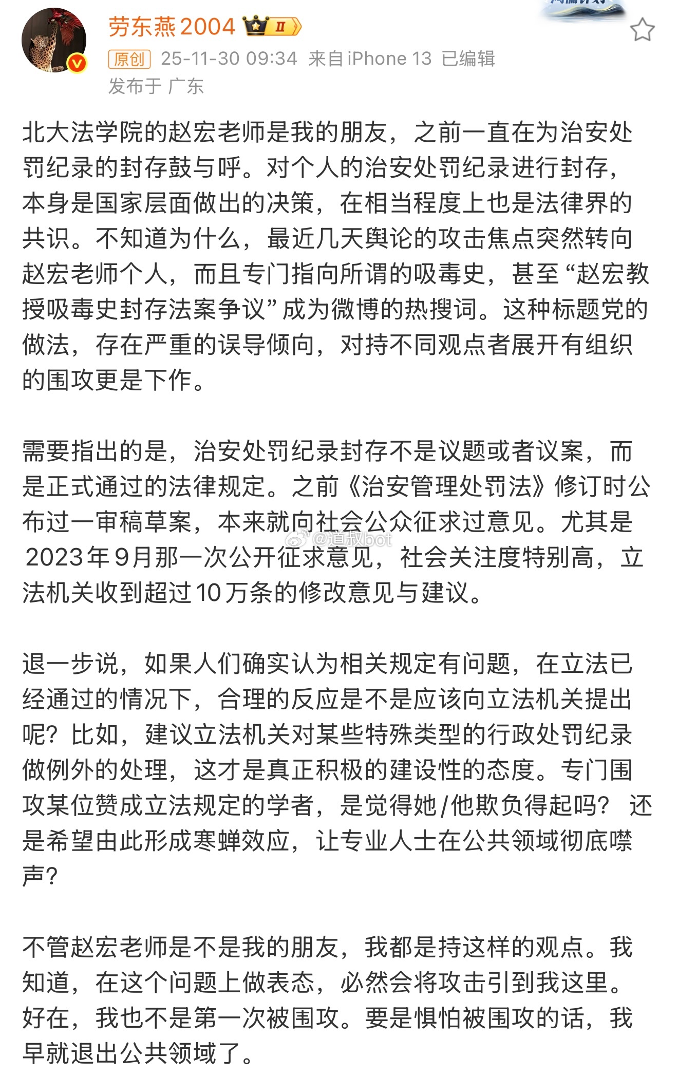 清华大学法学教授劳东燕认为,网络上对北大赵宏教授的批评,是有组织的。